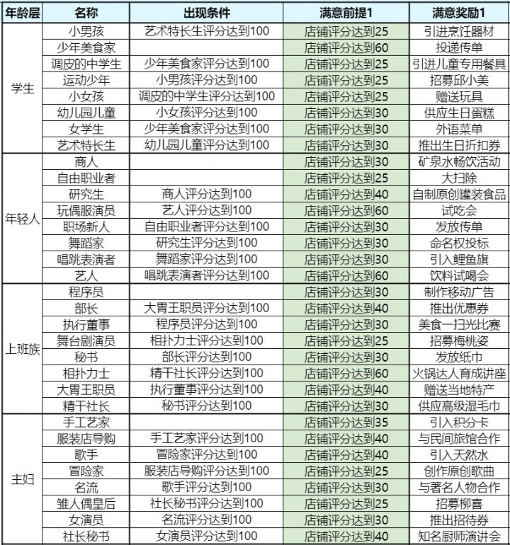 【顾客图鉴】顾客出现条件、满意前提和奖励一览