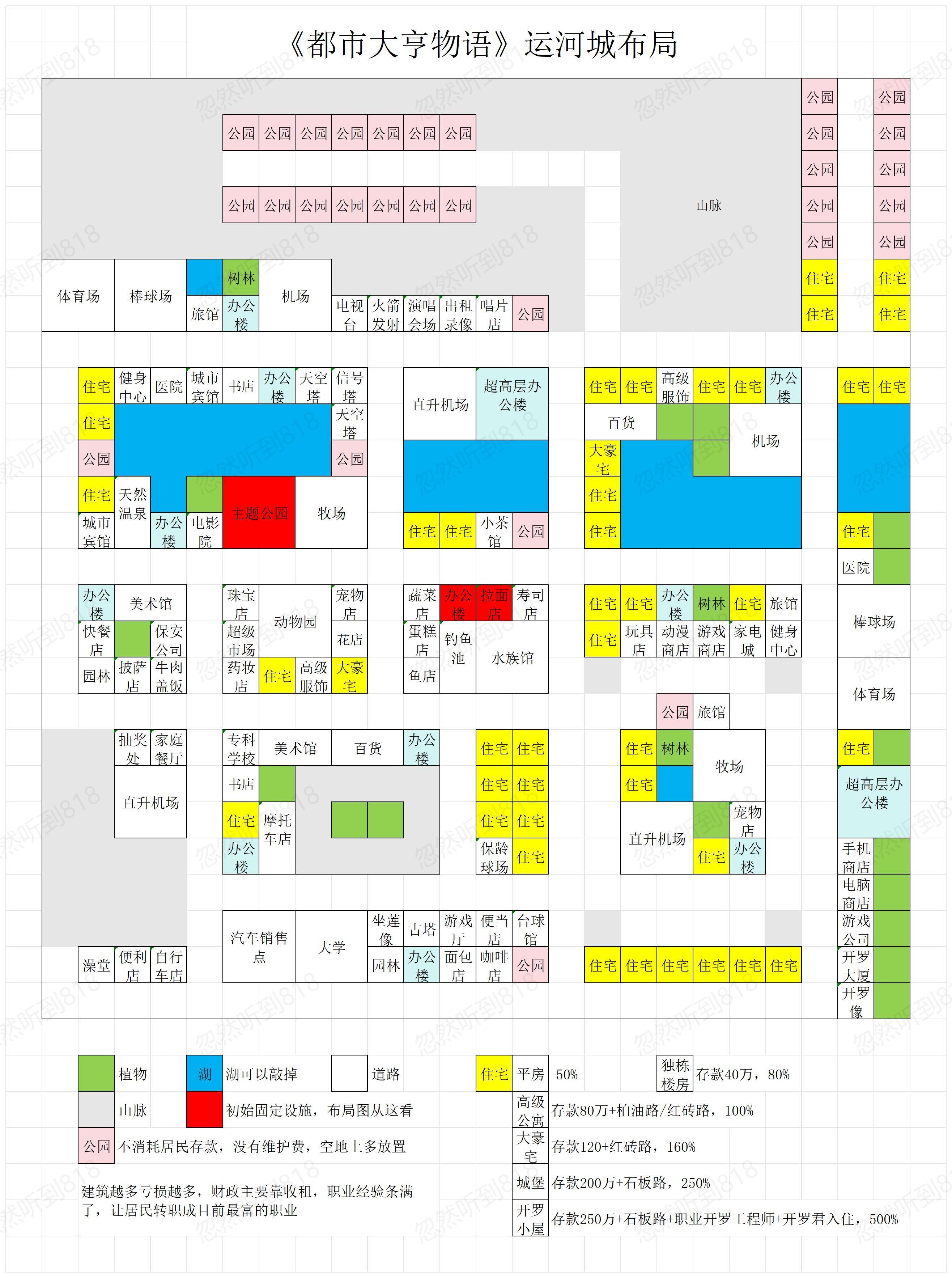 本人的布局图借鉴于网上的图,但是有两点不同和几点小技巧第一点不同是最高的地方换成了一个带有机场的商业街,这样双机场才能出火箭发射塔第二点是旅馆左边结果的树下面造了个办公楼,这样可以出冒险家小技巧:1图中很多的高层办公楼无法自然生成,有一种见效快但是耗资巨大的方法就是三个白塔拉高地价2该图一些职业无法自然形成,建议取右下角一部分竹林作为发现新职业的桥头堡,盖专属的建筑冲新职业3住宅周围的
