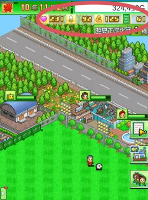 足球物语1攻略 开罗姬镇楼 系统介绍如上图所示 1.左上角为游戏时间,8年4月1日会计算通关点数,之后可以开启高速模式 2.右上角为金钱 3.金钱下面有四个点数,第一个为爱心值,用来举办活动;第二个灯泡点数主要用于赞助商,个别训练也用这个点数;第三个和第四个都是锻炼点数,用于特别训练 4.右边中间三个图标,从上往下,第一个是特别训练快捷键;第二个是经营俱乐部快捷键;第三个是球队编制快捷键 5.左下