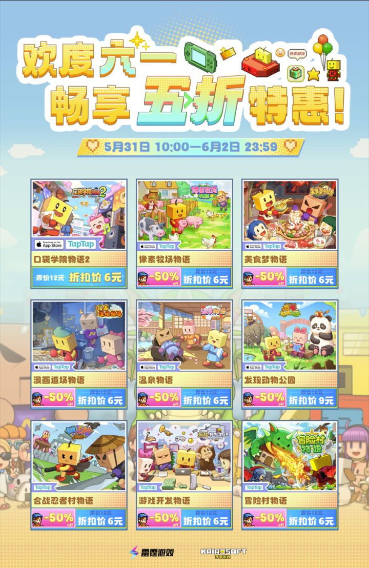 大家好,这里是开罗运营小队o(* ̄▽ ̄*)ブ!六一儿童节就要来咯~不知道大家有多少属于童年的回忆是和开罗一起度过的呢,还记得小时候玩的第一款开罗游戏吗?在这个美好天真的节日里,小队在这祝各位大朋友们儿童节快乐!欢度六一怎么能少了好玩的开罗游戏呢~小队今天为大家准备了儿童节特价福利,欢度六一,畅享五折特惠!TapTap和AppStore均能享游戏折扣福利!活动时间为: 5月31日10:0