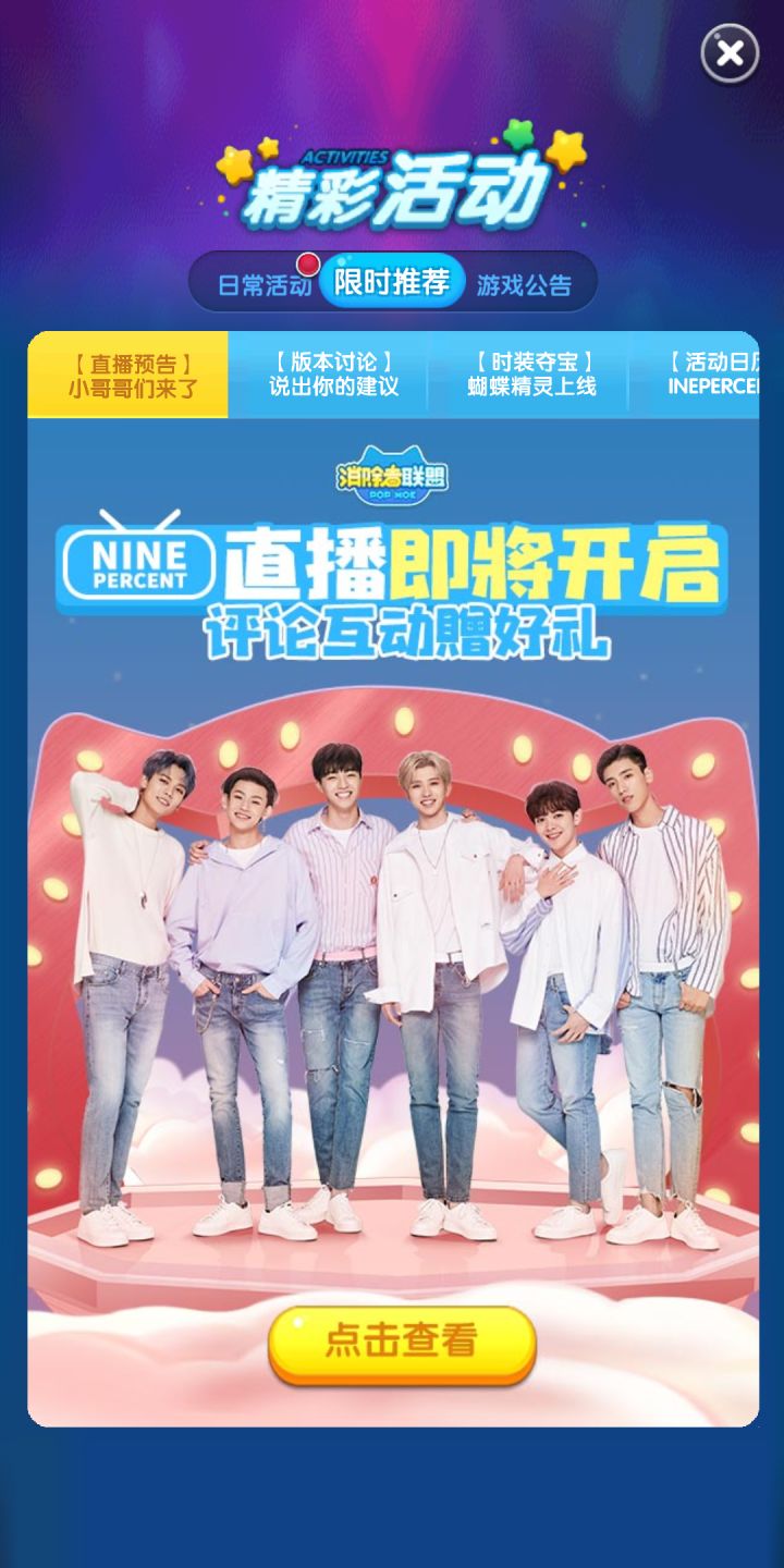 欢乐的“六一节”即将来临,各位大朋友小朋友们准备好了迎接自己的节日了吗,反正喵星星可是准备了一大波节日惊喜哟!NINEPERCENT小哥哥们直播活动撞上仙童节,给萌友们的福利当然不会少了,大家一起来看看有什么活动吧!【直播开启】小哥哥们今日17:00上线直播活动时间:6月1日17点活动介绍:小哥哥们的直播活动终于如约而至,将在今天17:00准时开启直播,大家要记得为自己喜爱的小哥哥们打cal