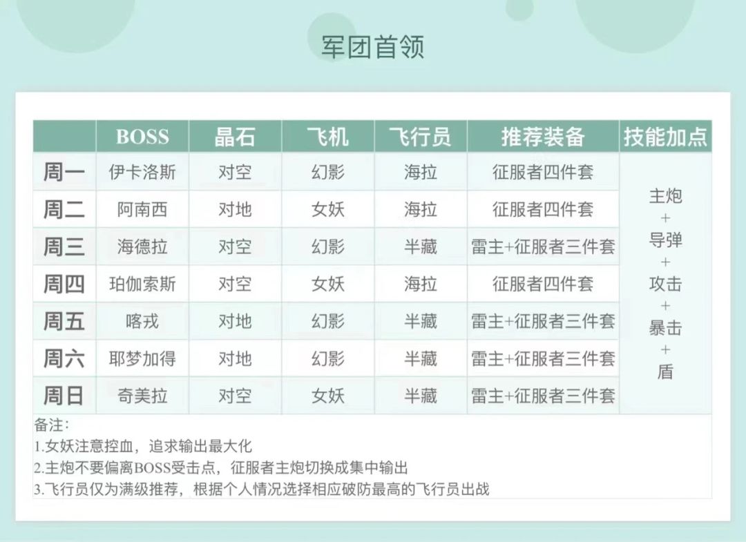 注明: 1、周五周六如要对自己的技术有信心,可以用女妖 2、3套毕业大佬推荐如下: 周一、幻影+雷主+毁灭3件套 周二、女妖+雷主+毁灭3件套 周三、幻影+雷主+毁灭3件套 周四、幻影+征主+毁灭3件套 周五、幻影+雷主+毁灭3件套 周六、毁灭者战机+雷主+毁灭副炮+导弹+征服者盾 周日,女妖+雷主+毁灭3件套