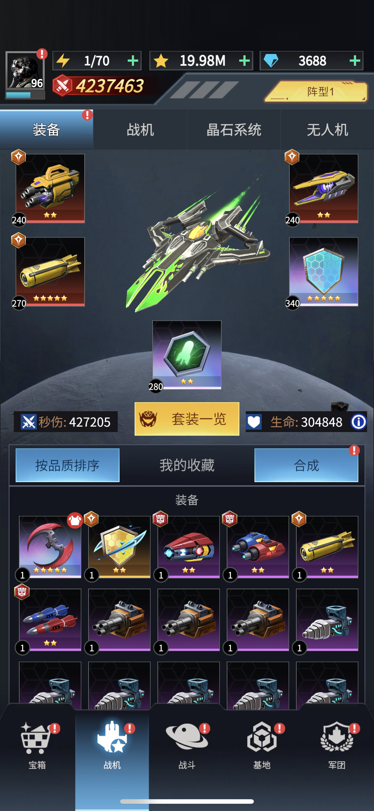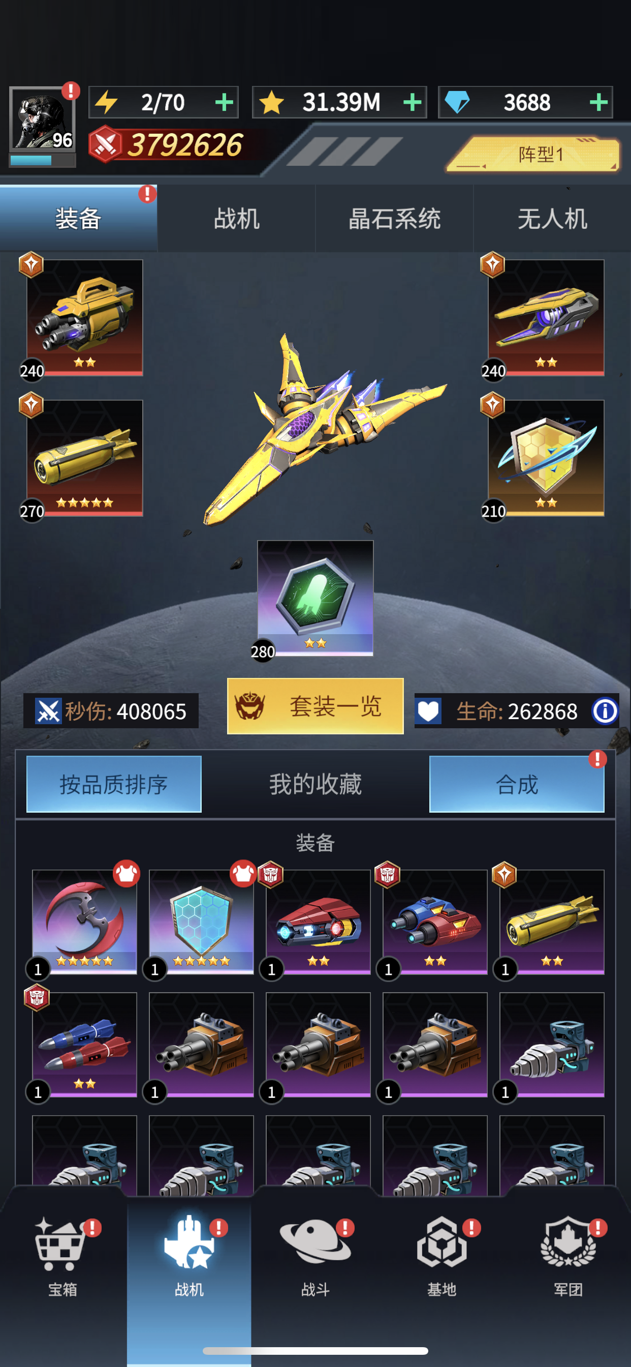 兄弟们:找个好团,对拉钻和领资源都是很舒服的。钻石是整点刷新,多刷出1个,前提是有空位,满8个,就不刷新了,需要时间到手动刷新。简易提升战力,拉力。可以把每架飞机升级到20级。 红1星。60级。 可以注意观察,每样的提升都是所有飞机一起提升。 前期就前面两样,拉力可以到35W。剩下的就是可以把主要的10个飞机先升星和级。提升拉力。 同等级套装比散装好,散装高级比低等级的好。 想挂机星星多得些,可以