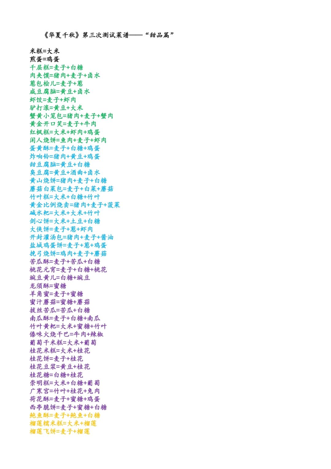 烤鸡=鸡肉 清蒸鱼肉=鱼肉 炸猪排=猪肉 熟牛肉=牛肉 蟹肉煲=蟹肉 烤全羊=羊肉 手撕烤兔=兔肉 烤鹅=鹅肉 海鲜饭=大米+虾肉 西湖醋鱼=鱼肉+醋 杭州酱鸭=鸭肉+酱油 蛋肉肠粉=猪肉+麦子+鸡蛋 酥炸鱼肉=鱼肉+鸡蛋 水饺童鸡=鸡肉+猪肉+麦子 土豆炖牛肉=牛肉+土豆 黯然销魂饭=猪肉+大米+鸡蛋 霸王别姬=鸡肉+甲鱼肉 地锅鸡=鸡肉+麦子 九转大肠=猪肉+酱油 虾仁猪心汤=猪肉+虾肉 葱爆