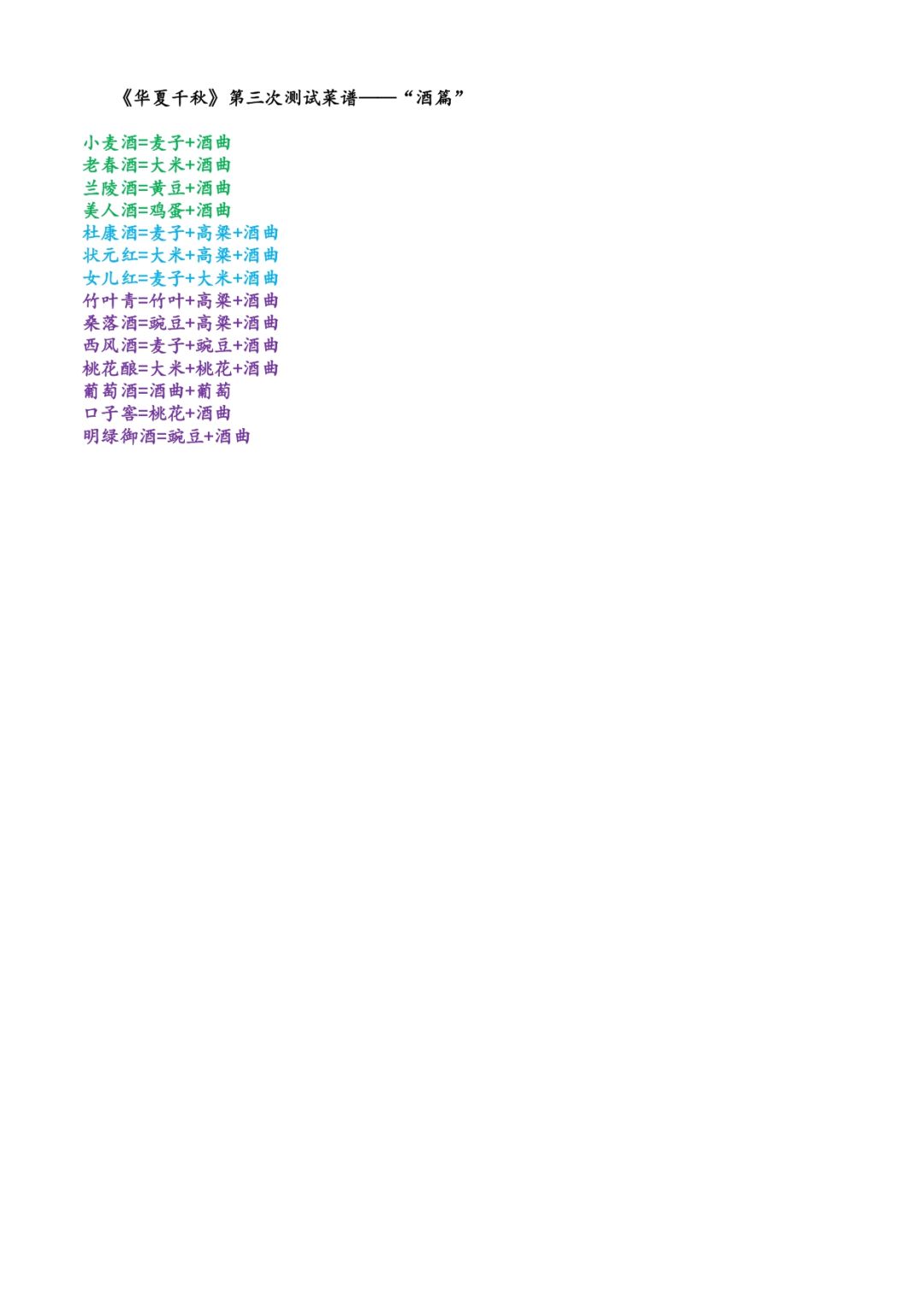 小麦酒=麦子+酒曲 老春酒=大米+酒曲 兰陵酒=黄豆+酒曲 美人酒=鸡蛋+酒曲 杜康酒=麦子+高粱+酒曲 状元红=大米+高粱+酒曲 女儿红=麦子+大米+酒曲 竹叶青=竹叶+高粱+酒曲 桑落酒=豌豆+高粱+酒曲 西风酒=麦子+豌豆+酒曲 桃花酿=大米+桃花+酒曲 葡萄酒=酒曲+葡萄 口子窖=桃花+酒曲 明绿御酒=豌豆+酒曲 #华夏千秋 #菜谱 #酒