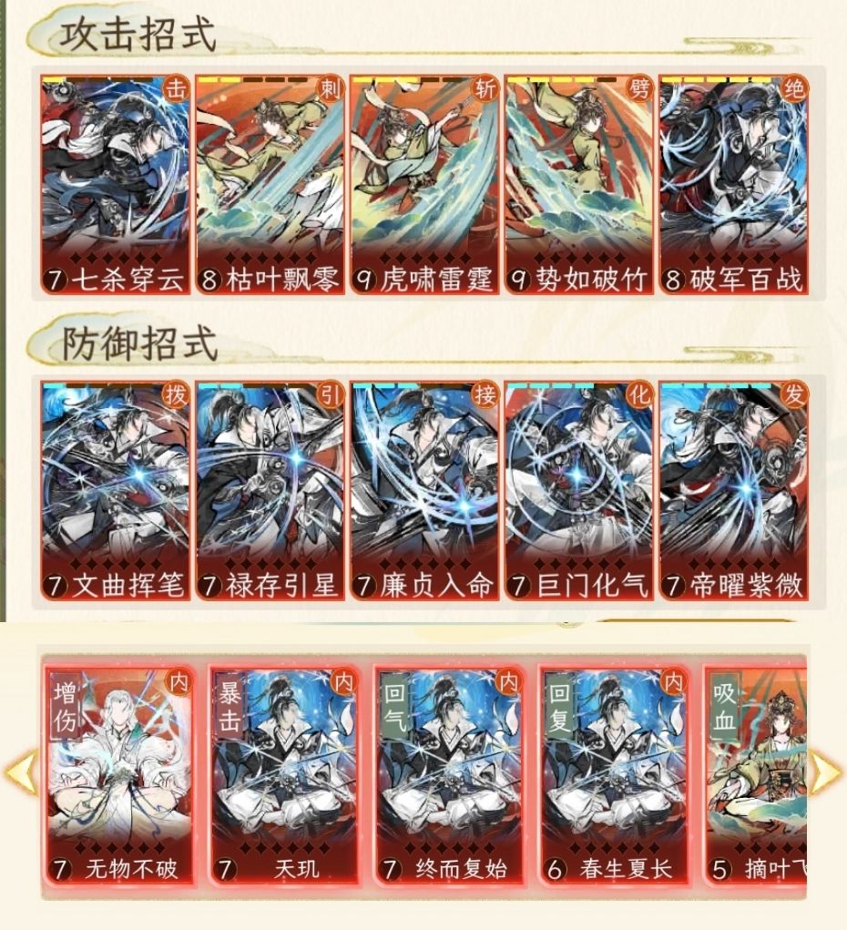 华夏千秋的战斗系统主要围绕气展开,使用的招式气越多,效果命中越强。不仅可以压制气低的招式,还可以有更多博弈的资本。例如我方5气,敌方3气。此时敌方如果选择进攻,则大概率会被我方4-5气的招式克制。如果选择防守,需要博弈我方使用3-5气中的哪一个招式。因此气力差越大,博弈优势越明显。 而游戏中可以携带的武功,5攻击5防守以及目前看不到上限的内功,可以完全自由组合,同一流派的某些内功组合在一起可以形成