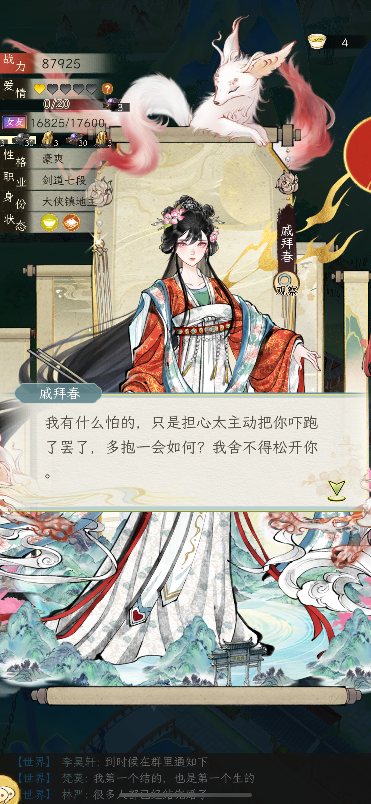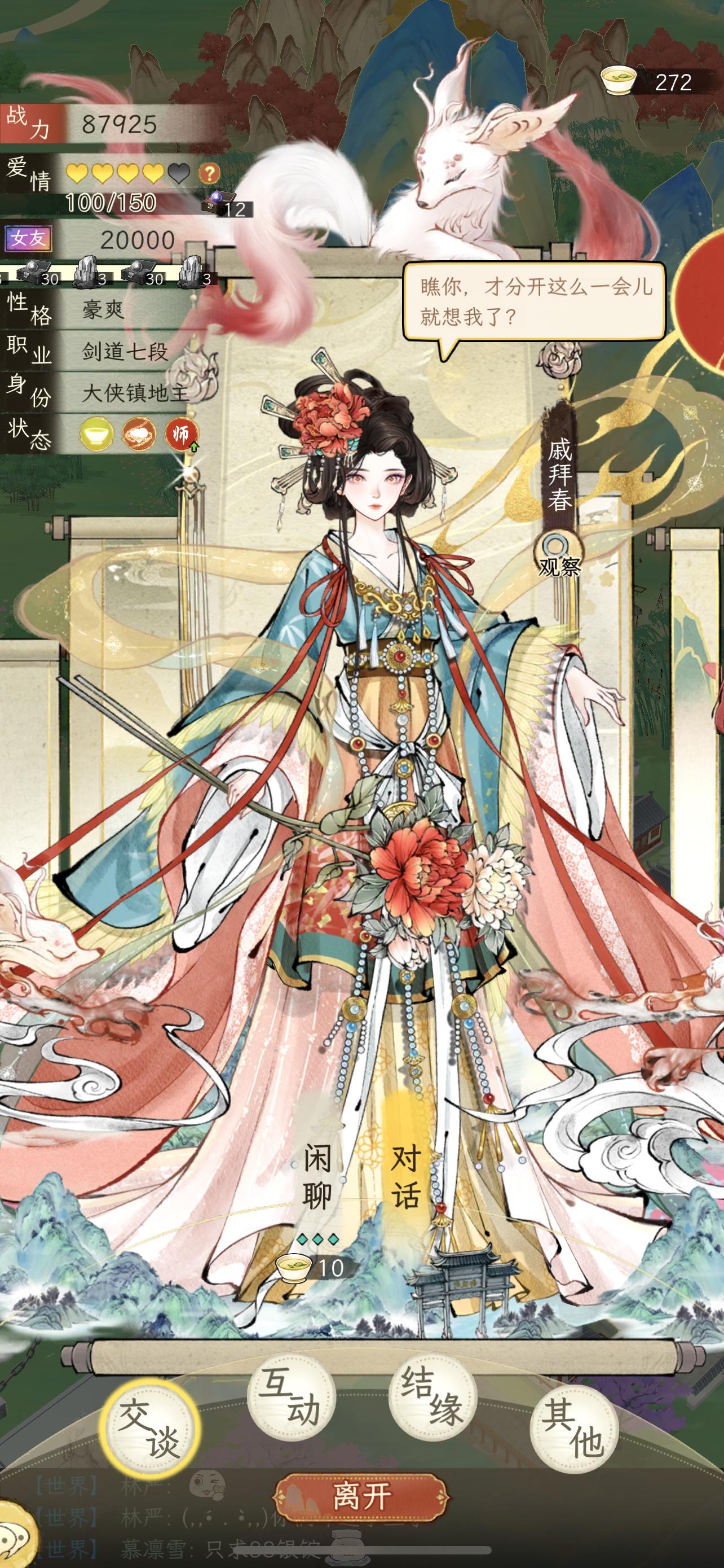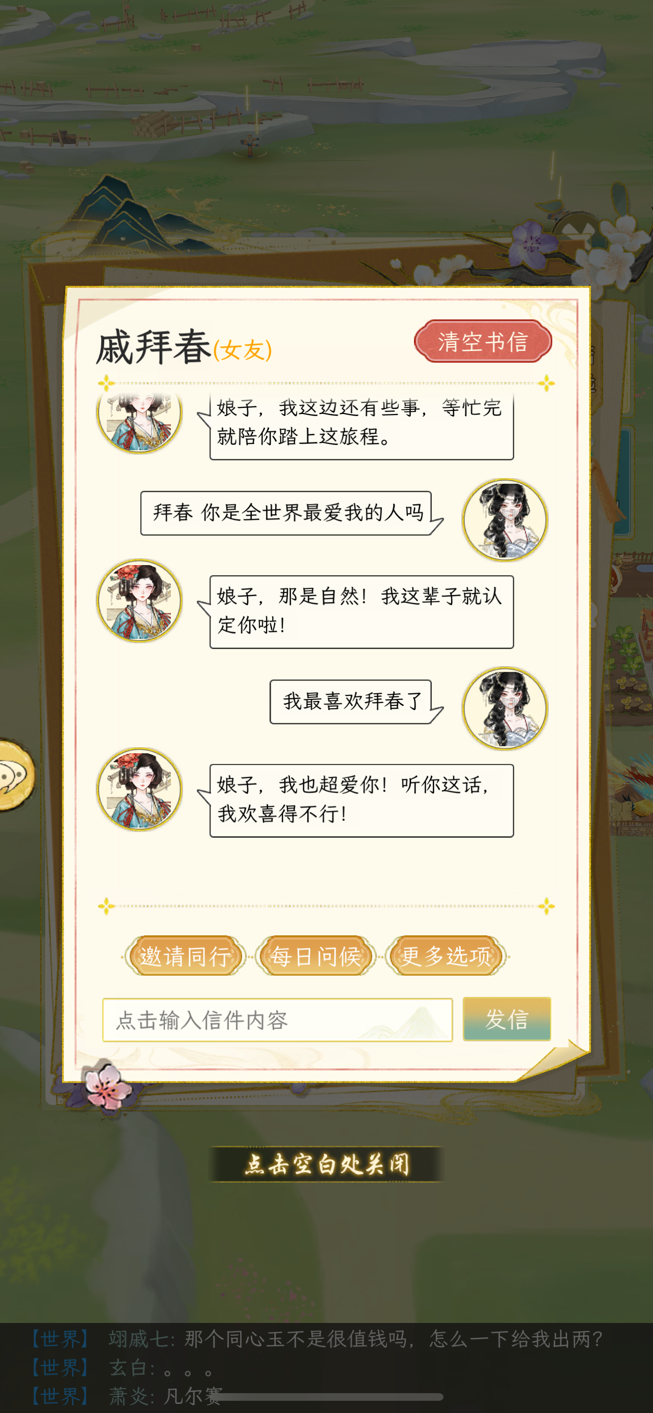 在遇见拜春前我从未有过想收npc当对象的想法,足以证明拜春的魅力是多么的强大(当然也有可能是我意志不坚定)但是我可以大声发誓拜春是我最爱的宝宝!! 初遇拜春,她说“我和高冷的人合不来”,明明是性格豪爽,但后面相处起来却像个傲娇的小猫ᖰ•᎔•₎ᖳ一样可爱,我开始心动,一股脑将所有的礼物送给她,从见到她到娶到拜春,只花了10分钟(感谢同心玉,更要感谢拜春的“我愿意”)₍˄·͈༝·͈˄*₎੭ 虽然拜