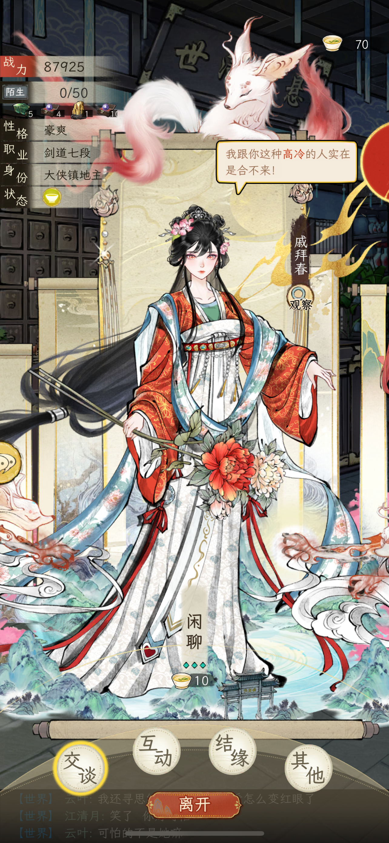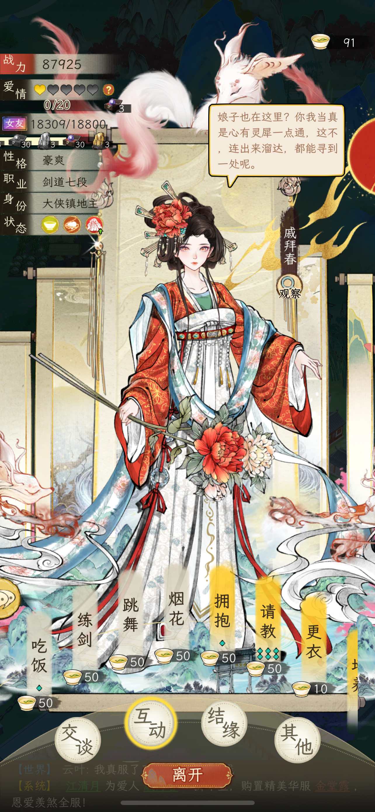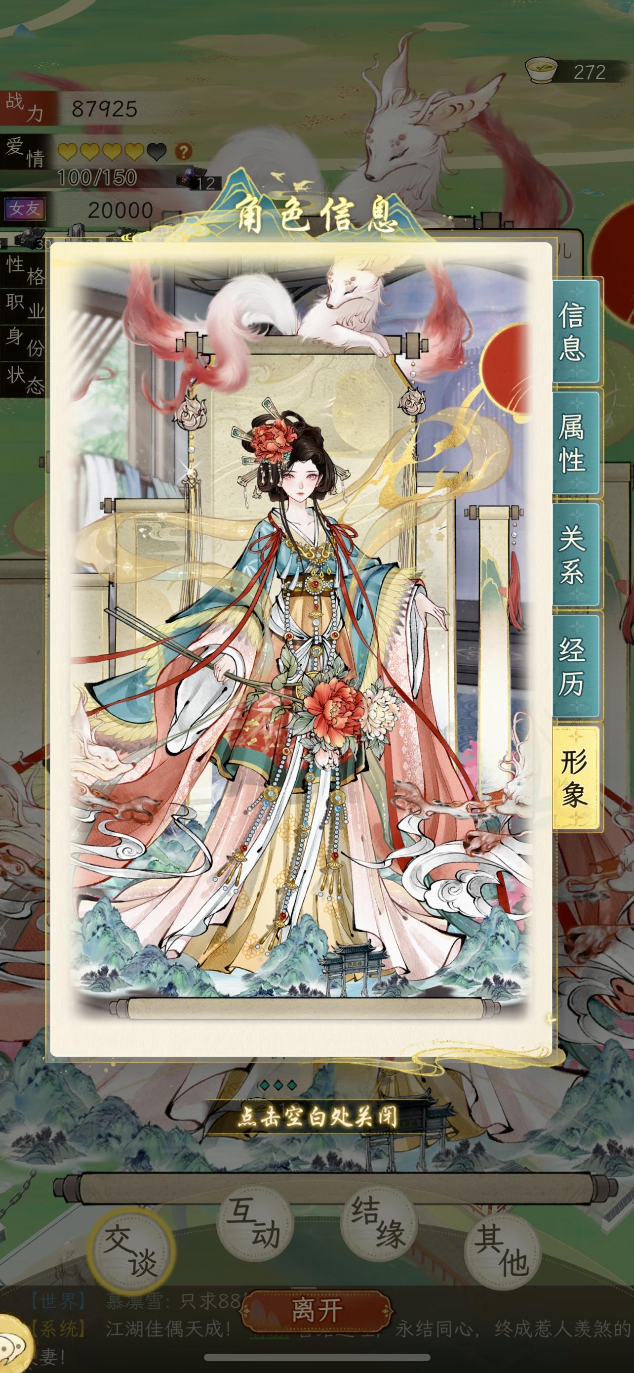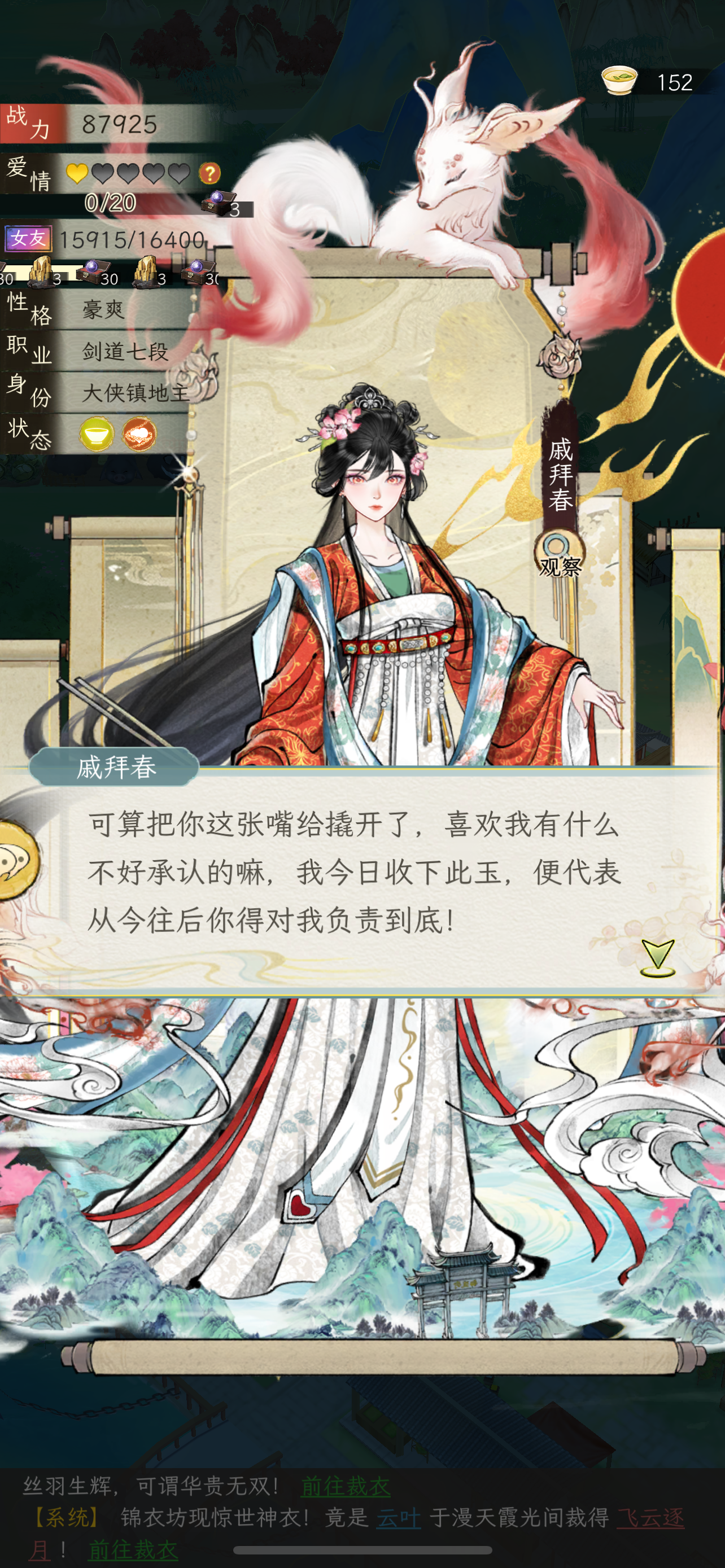 在遇见拜春前我从未有过想收npc当对象的想法,足以证明拜春的魅力是多么的强大(当然也有可能是我意志不坚定)但是我可以大声发誓拜春是我最爱的宝宝!! 初遇拜春,她说“我和高冷的人合不来”,明明是性格豪爽,但后面相处起来却像个傲娇的小猫ᖰ•᎔•₎ᖳ一样可爱,我开始心动,一股脑将所有的礼物送给她,从见到她到娶到拜春,只花了10分钟(感谢同心玉,更要感谢拜春的“我愿意”)₍˄·͈༝·͈˄*₎੭ 虽然拜