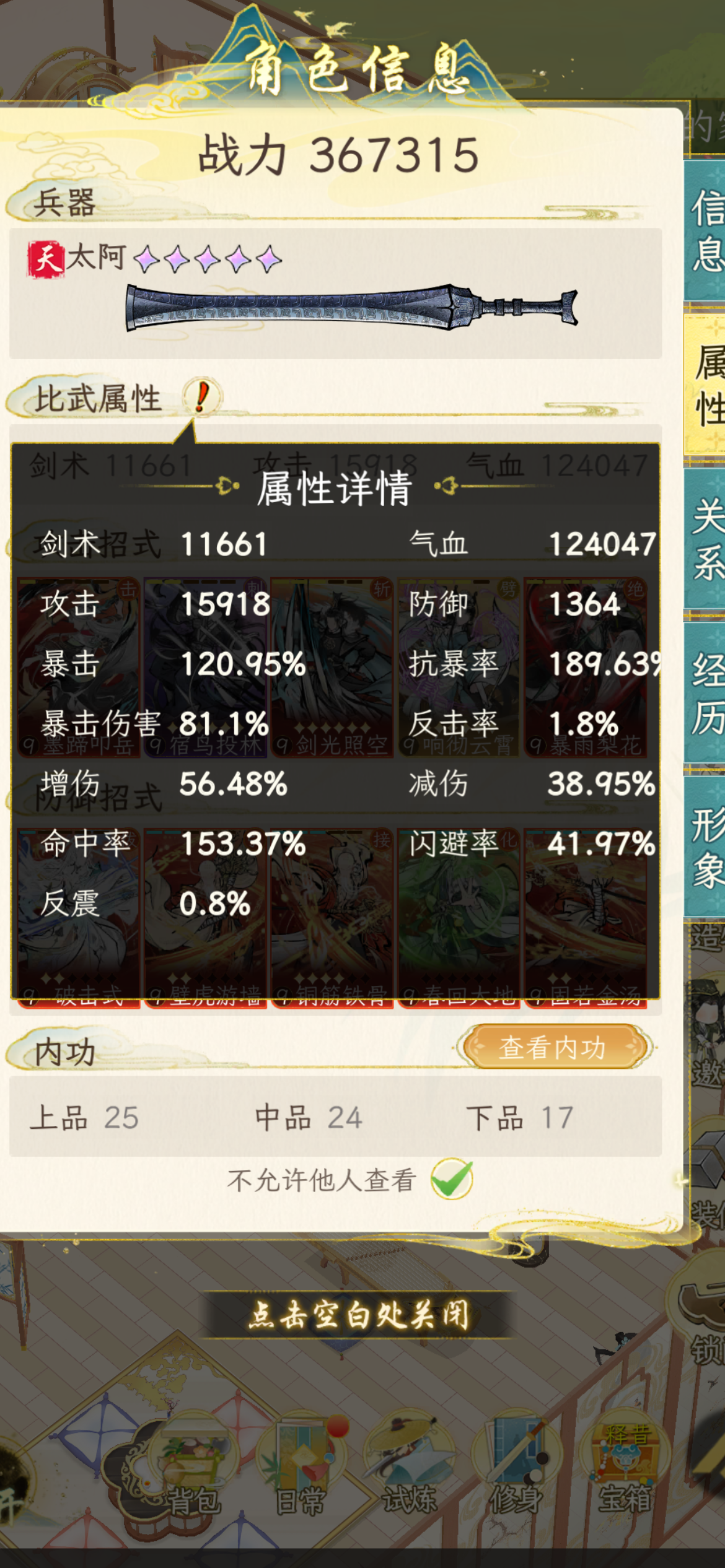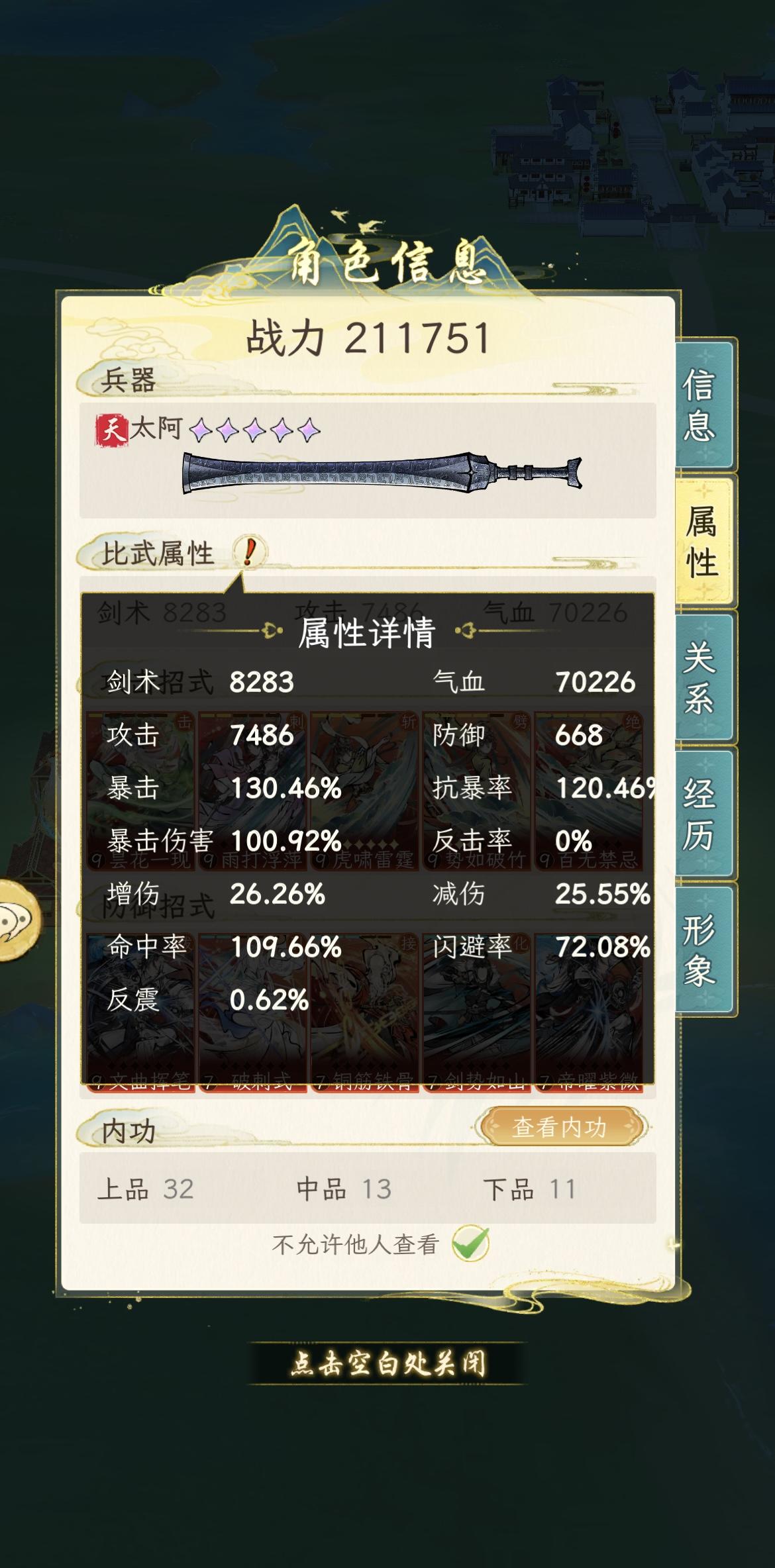 剑术不够还没升满,升满应该75,之后在抽到翻云覆雨的闪避,单面板的闪避就有83,加上我喜欢开局闪避刺34闪避,以及凤凰的刚猛还有降低命中的内功,pve先不说pvp一定很爽