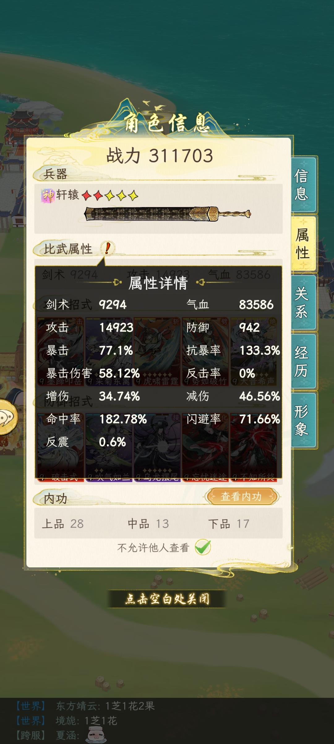 武馆阵法全通弦月91关差900防御(开锋的词条就给了我200多的防御,宠物词条还没刷出来防御,如果我给防御内功全升了,大概能给300,那就是差2100-1200-300-200=400,宠物词条真的能给到400吗?我还是再指望指望开锋吧)剑心这100块钱一块的玉也太不友好了,毕竟我跟零氪的唯一区别就是多了几个外观,等我过年发压岁钱再说吧神品的衣服还差两套就齐了,日常自恋ing,感觉自己捏的脸