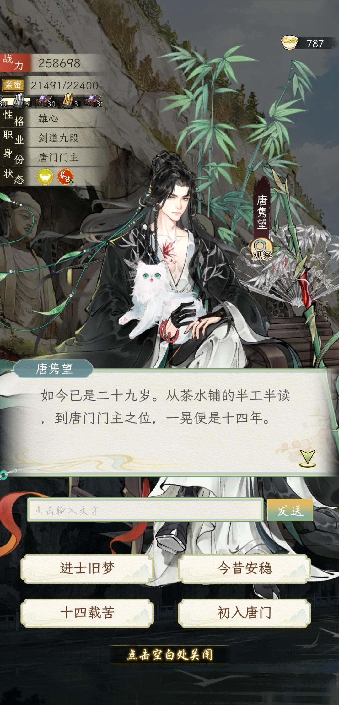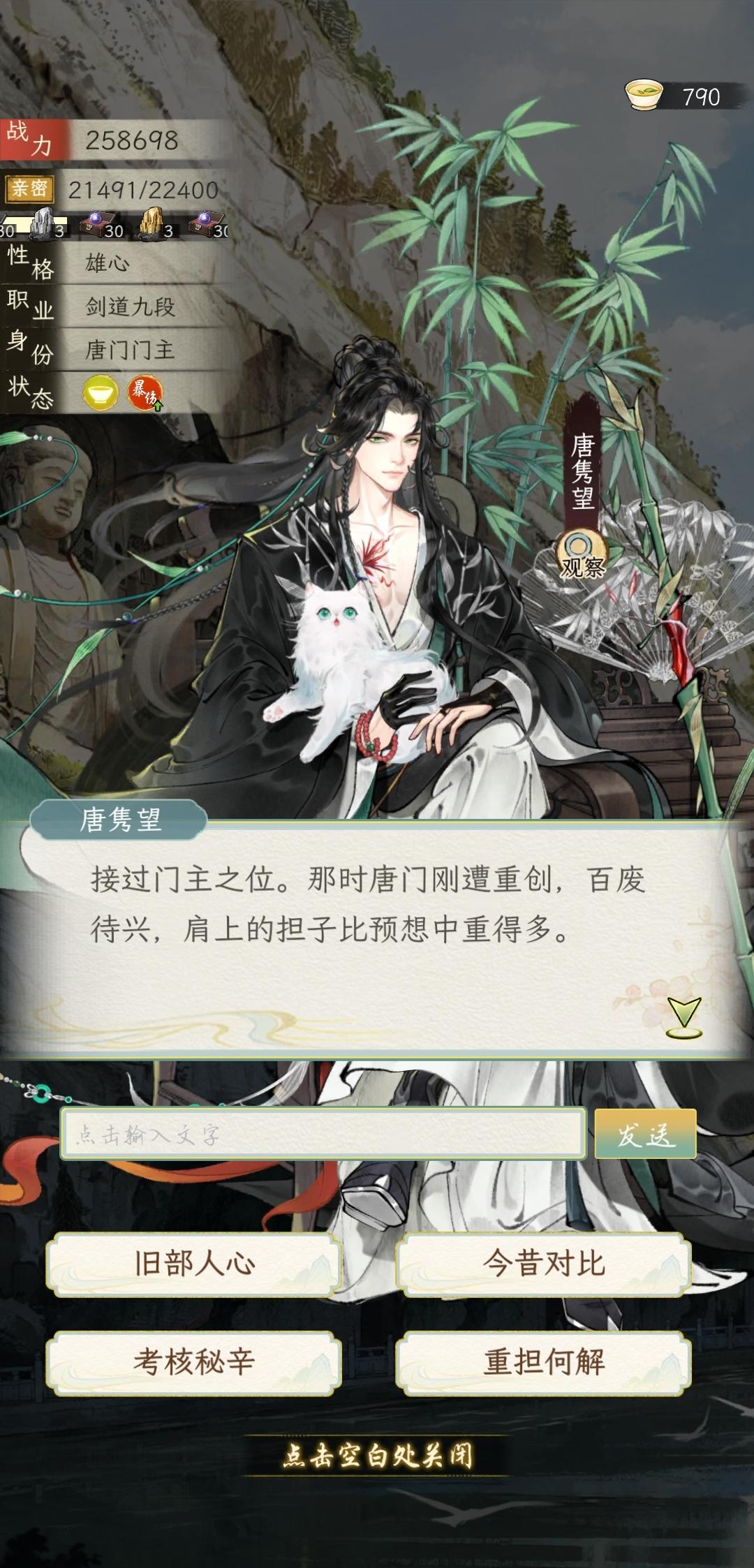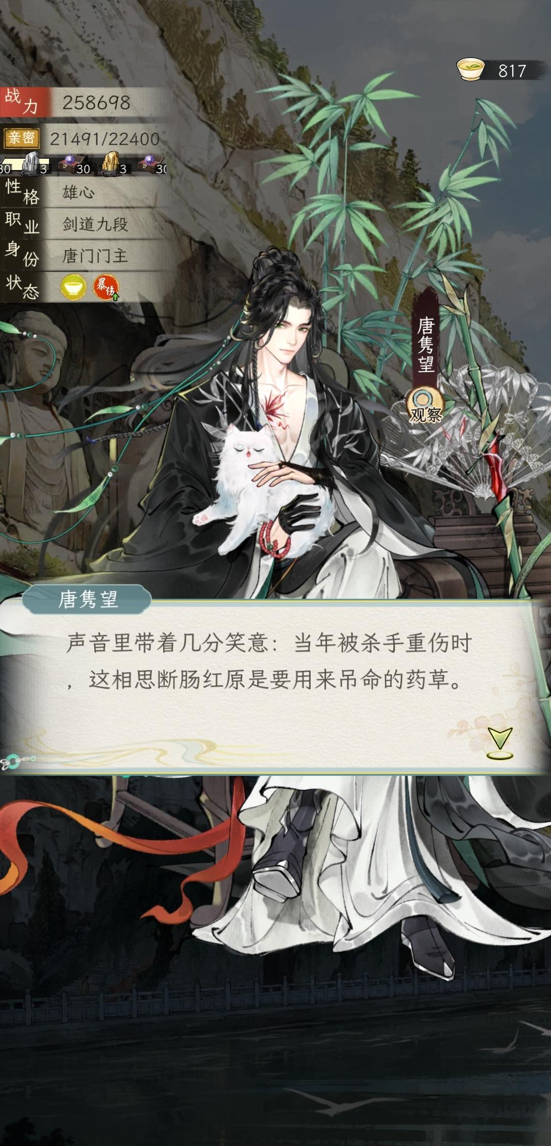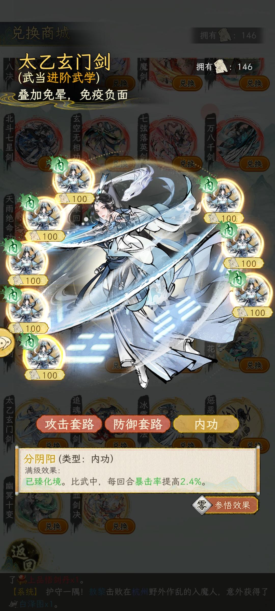 最强攻略,越女剑最详细攻略,开局选家世拿宝剑这个不多说了,选干将,无脑暴击流,三十抽抽功法里面有15抽,另外五抽随便凑一凑,心愿选越女,最好是越女劈出来,其他无所谓,越女核心要看内功牛不牛逼,防御外攻,无脑堆暴击,,这里重点讲一下拜师,前期找个好师傅等于直接氪金1k左右。前面都是扯淡没含金量重点就在拜师。都去炼剑锋去武馆里面找乌月朗,找他拜师8500好感度第一天就能拿下,这里有一套峨眉初级内功那