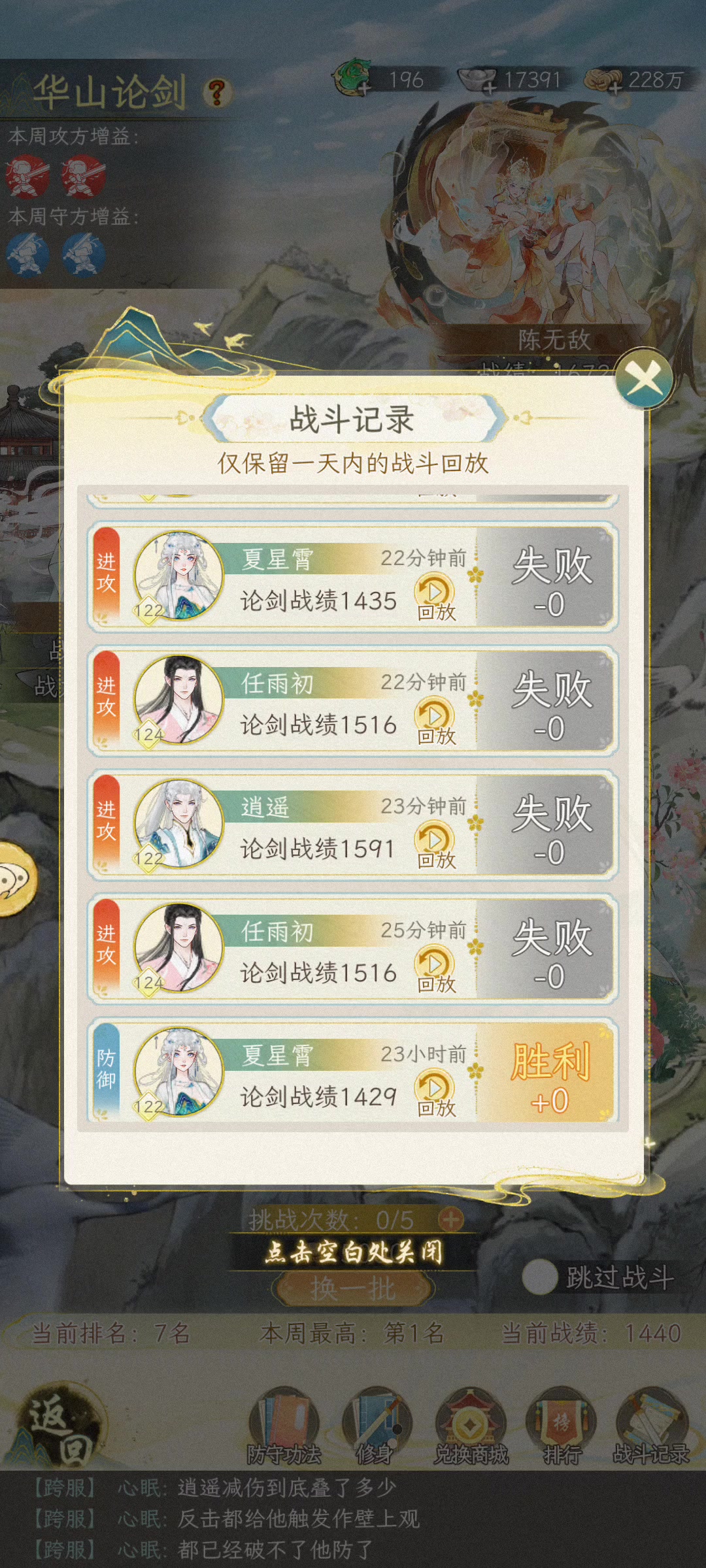 双人宗门(一人45w一人20w战力其余剑道8段天骄)连续4次拿下宗门战第一,感觉匹配的对手一次次在增强,下一周还能卫冕吗? 关于宗门战,如何手动调整npc内外功保证npc内战胜率,甚至战胜稍弱玩家是胜利关键;宗门战第二三天也可以通过调整站位去针对对自己排名有威胁的对手(根据几周的观察大部分宗主不会在宗门战期间调整站位) ps:明明有10个宗门在一组共打9场,为什么总有一两个宗门遇不上,有的宗门