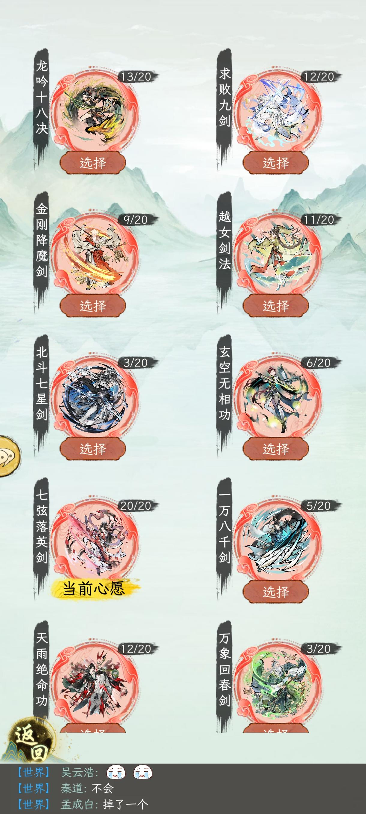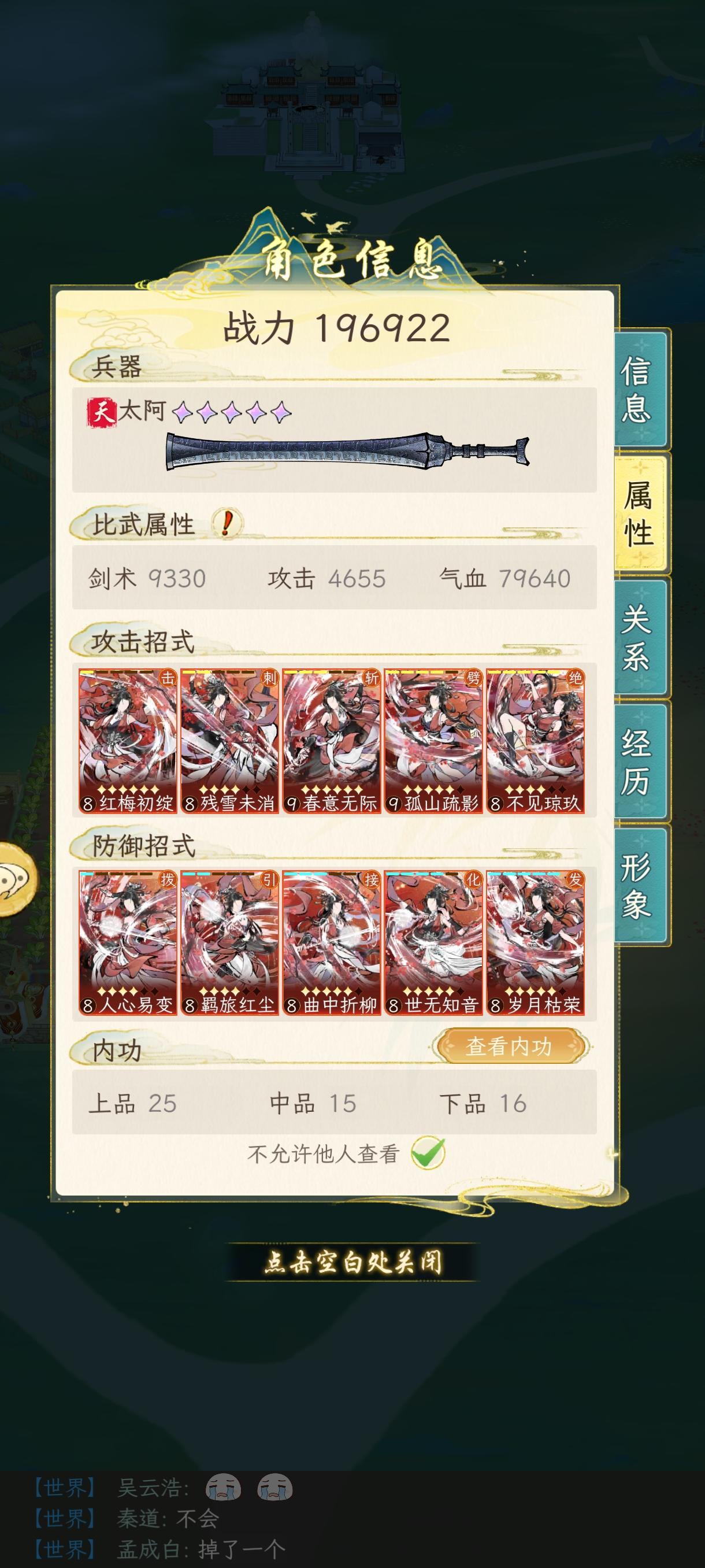 武馆前几天就已经通了,梅飞影依旧打不过…(反击致盲简直太阴了啊啊啊啊啊)弦月80关通了后期的时候星斗可摘和混元一气应该是必带的,不然吃了红内的反击反震打我一下真的遭不住,看到自己这个偏科的攻击和已经几乎随便被碰一下就蒸发的血量,想到那个日漫,因为怕痛所以就全点防御力了,嗯对,因为太莽所以就全点攻击力了(?)剑意依旧不够用,放嘲讽绝如果被打死还要给他跪着半天才能放我走,神驹踏山河的功法碰到嘲讽,