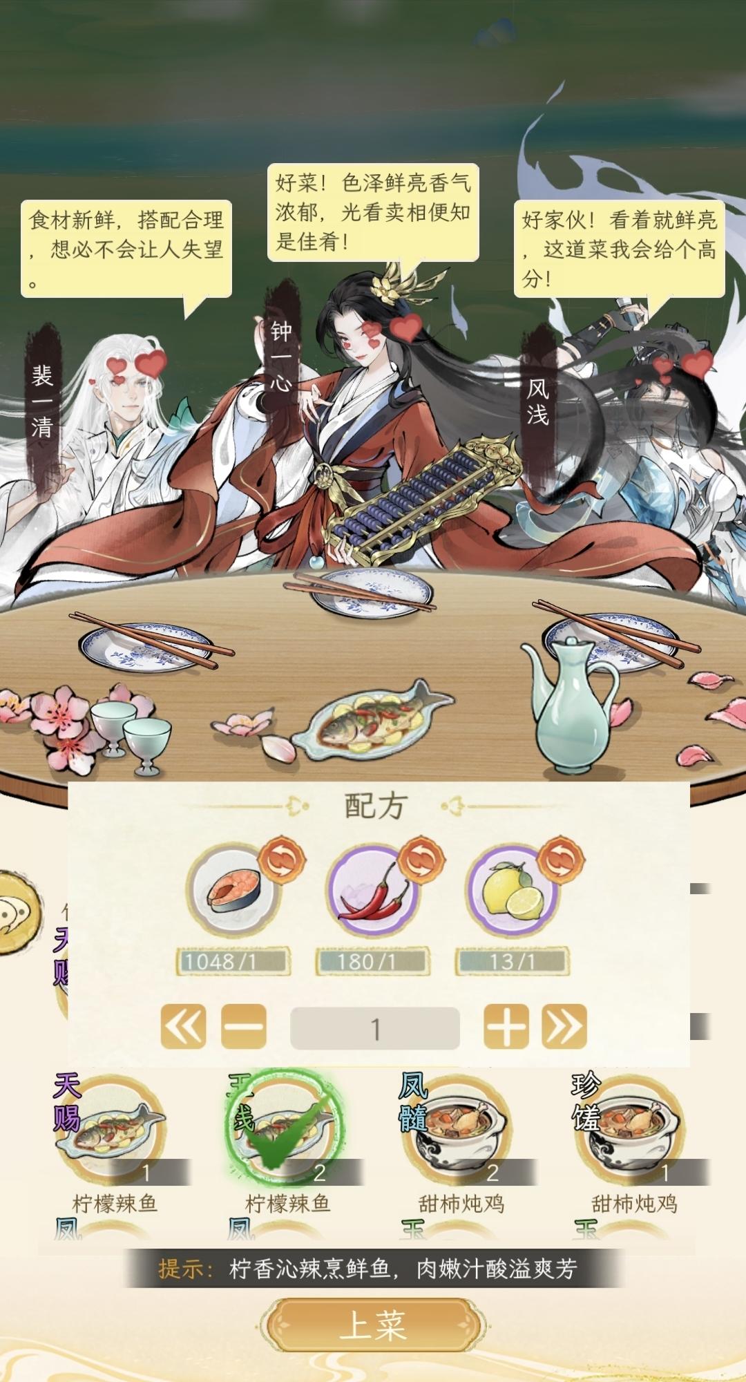 合适的:柠檬辣鱼。配方:鱼肉➕辣椒➕柠檬。特级鱼肉➕高级辣椒➕高级柠檬=天赐我有511魅力值,交了6000多分,见p2。#华夏千秋