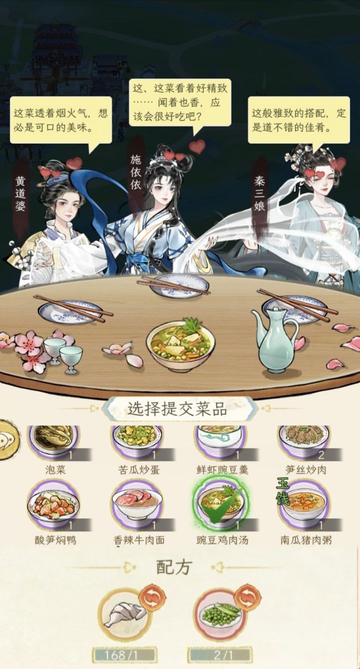 合适的:①甜柿炖鸡:鸡肉➕蜜糖➕柿子;(特级鸡肉➕高级蜜糖➕高级柿子=甜柿炖鸡·天赐)②南瓜鸡肉煲:鸡肉➕南瓜;③豌豆鸡肉汤:鸡肉➕豌豆;(特级鸡肉➕特级豌豆=豌豆鸡肉汤·紫天赐,p4如图,p5是lz交的天赐豌豆鸡肉汤的评分,lz有490魅力值,才5k多分,建议有材料的还是做甜柿炖鸡,点题)二编补充一下谢谢大佬们#华夏千秋