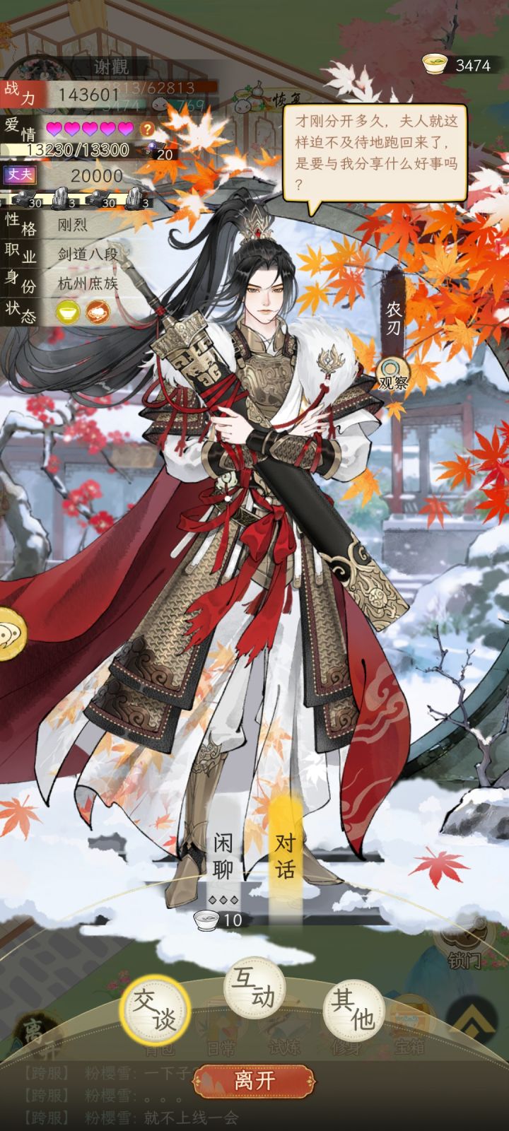 是这样的,把这款华夏千秋单机游戏玩成了乙女恋爱游戏,全服我是第一个。所有专属和绝代都满攻略了,还有好看的天骄和普通小哥哥,各个都是雪儿严选(姿色绝对是数一数二,名字也好听)。我数了一下,目前一共有380个男友,1个老公。别问我怎么玩的,没有氪金,就氪了喵喵助手,目前近25万战力,家园早就满等级了。 #华夏千秋 #我在华夏千秋谈恋爱 #华夏千秋人脉 #华夏千秋剧情