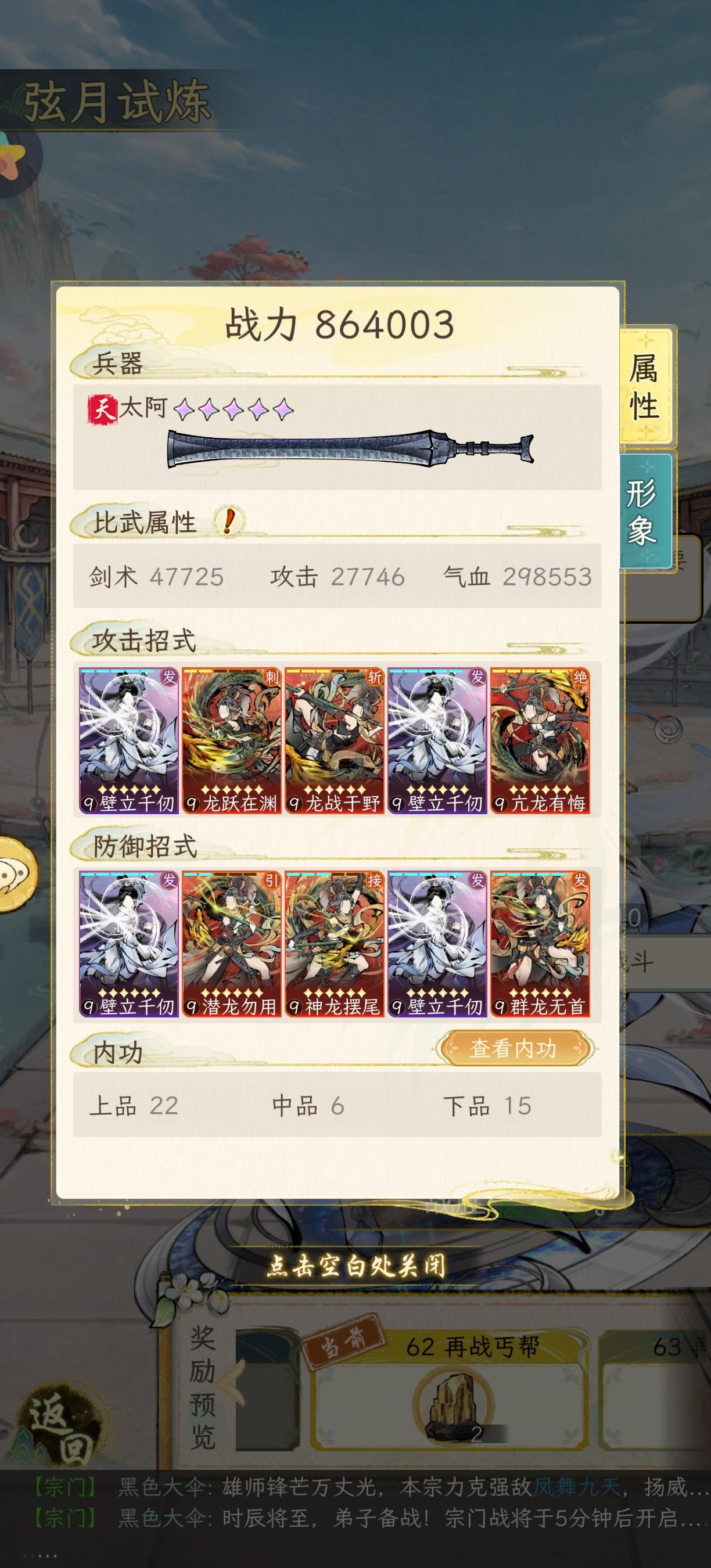 武馆前几天就已经通了,梅飞影依旧打不过…(反击致盲简直太阴了啊啊啊啊啊)弦月80关通了后期的时候星斗可摘和混元一气应该是必带的,不然吃了红内的反击反震打我一下真的遭不住,看到自己这个偏科的攻击和已经几乎随便被碰一下就蒸发的血量,想到那个日漫,因为怕痛所以就全点防御力了,嗯对,因为太莽所以就全点攻击力了(?)剑意依旧不够用,放嘲讽绝如果被打死还要给他跪着半天才能放我走,神驹踏山河的功法碰到嘲讽,
