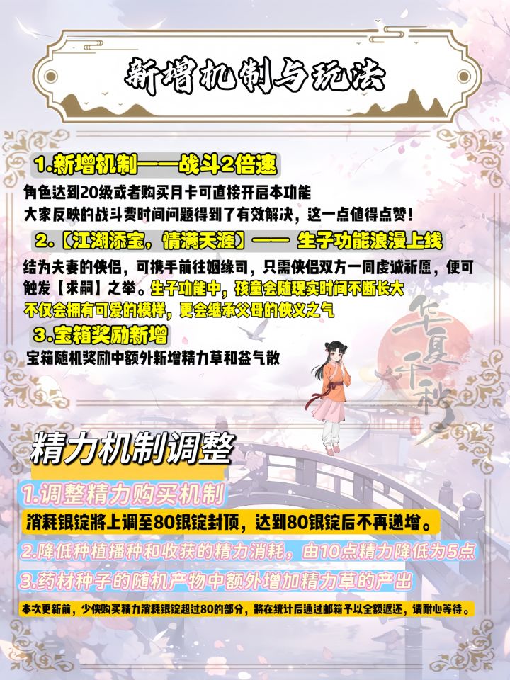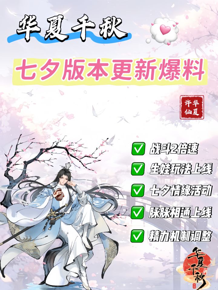 华夏千秋七夕版本大更新!少侠们都看过了吧本次主要更新了少侠们反馈的种田精力消耗过大,精力不足问题,战斗时间过长问题以及更新了许多新增的玩法和机制⭐️让我们一起来看看吧!一、战斗2倍速许多少侠都有反馈战斗太慢了,动作太多时间太长,这次终于迎来了更新!2倍速就可以加快战斗节奏,同时动作流畅度也会上升!更加炫酷啦二、生娃玩法上线生娃玩法上线啦!版本更新后,去姻缘司可以求