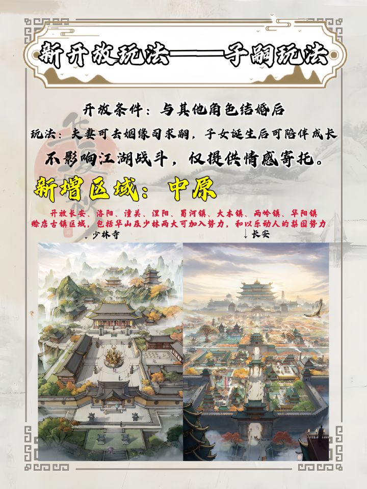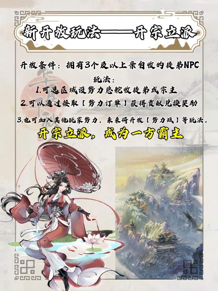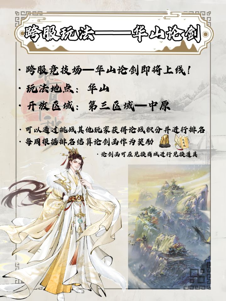 1. 跨服竞技场-华山论剑🗡 - 地点:华山;开放区域:第三区域-中原;开放时间:以版本更新公告为准。- 玩法:挑战玩家获论剑积分并排名,每周按最高排名结算论剑函,可在论剑商店兑换道具。2. 新玩法-开宗立派🚪 - 开放条件:拥有3个及以上亲自收的徒弟NPC;开放时间:以版本更新公告为准。- 玩法:可选区域设势力总舵收徒弟成宗主,接【势力订单】获贡献换奖励;也可加入其他玩家势力,