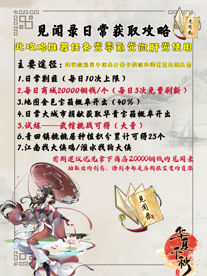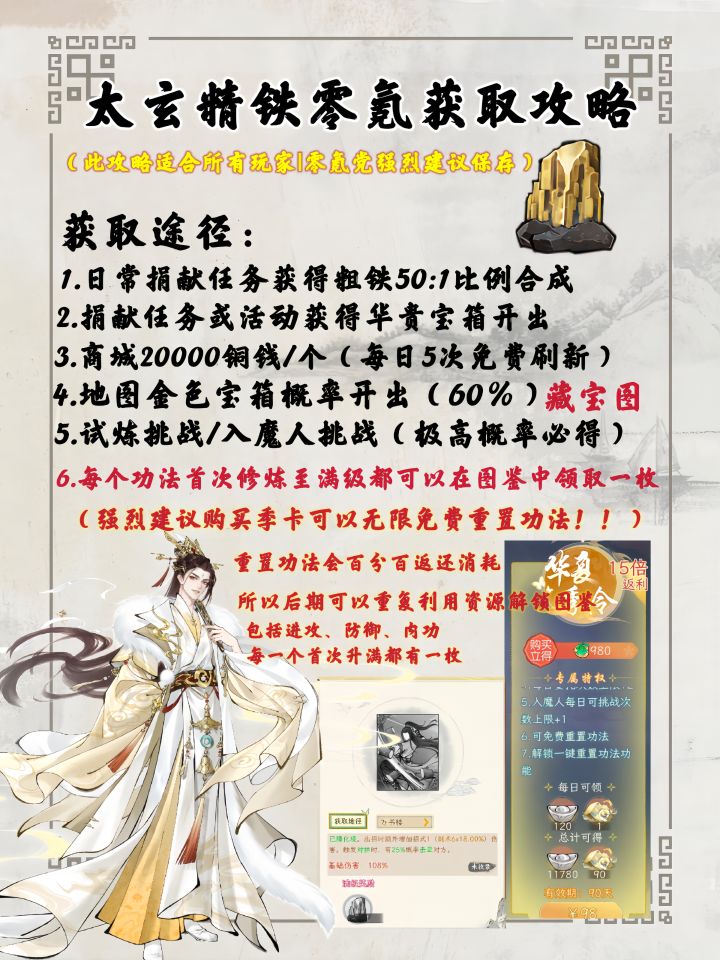 👋好多宝子们说不知道游戏内抽武学和锻造的资源怎么获取,我整理了一下游戏内适合零氪党和任务党的见闻录和太玄精铁收集攻略给大家!🔥再次强调!!!非常建议宝子们开季卡!真的超级划算性价比很高!P3图鉴里的太玄精铁开通了季卡的宝子一定要记得领取!预计总共可以领到300枚🔥最后祝大家都能抽到心仪的武学,下一期想看什么教程评论区留言,我马上出#华夏千秋 #我在华夏千秋谈恋爱 #华夏千秋攻略