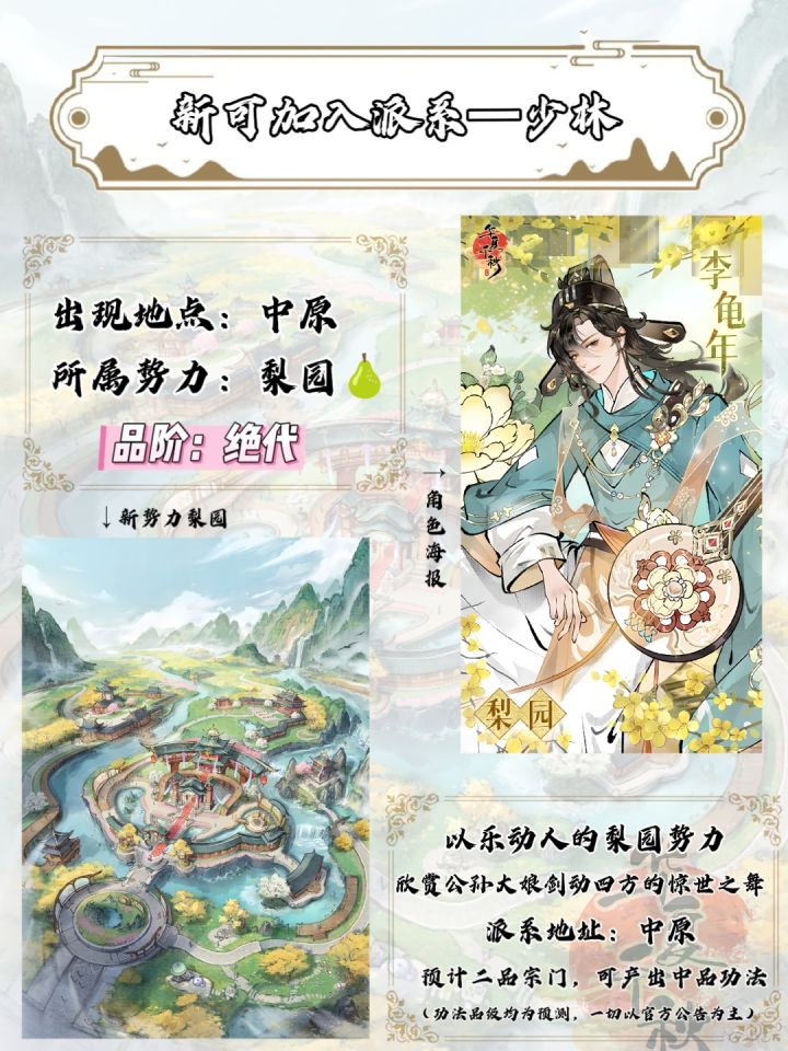 1. 全新宗门-梨园🍐 - 开放区域:第三区域-中原;开放时间:以版本更新公告为准。- 代表人物:公孙大娘、李龟年2. 全新开放可加入宗门-少林🏯 - 开放区域:第三区域-中原;开放时间:以版本更新公告为准。- 代表人物:本德 3. 全新开放可加入宗门-华山🏞- 开放区域:第三区域-中原;开放时间:以版本更新公告为准。- 代表人物:陆无咎 4.更多全新玩法-开宗