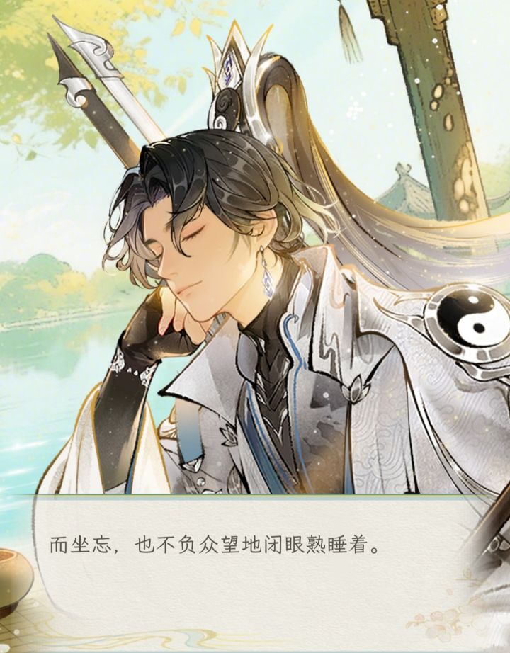 坐忘前半生的经历真的很传奇,虽然他自己大概率不会承认。因为嫌麻烦,骨子里叛逆又认真,即使周围人总说他读书有些天分,他也不想入朝为官。顶着清河崔氏崔上真的名字闯江湖,却总被人误认为是华山弟子。“那我去武当就好啦。”于是他在十余岁的时候爬上山,拜师武当掌门张三丰,拿到了属于他的佩剑,取名为坐忘剑。坐忘认为,修行在心不在行。冬日的阳光是最能暖人的,抱着自己的爱剑打坐,恍惚之间感觉自己好像在云端、