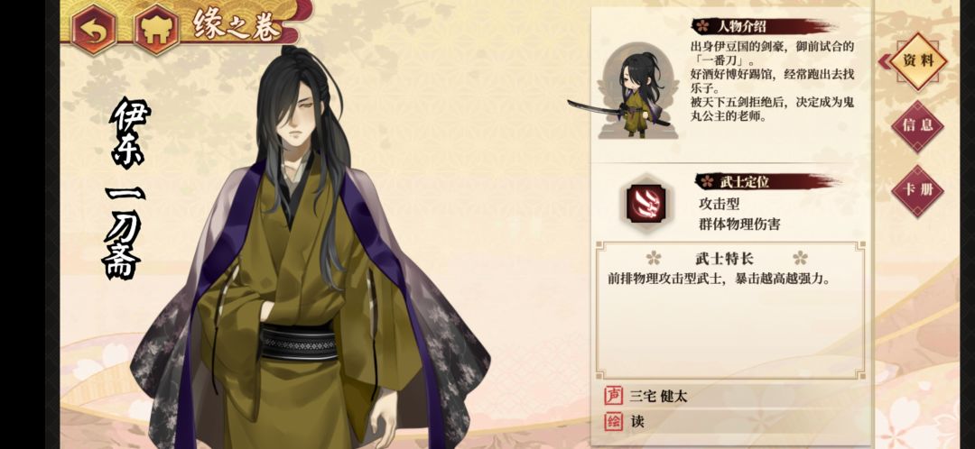 首发:伊东 一刀斋 使用武器:太刀 推荐剑质:追击 推荐副属性:攻击 推荐词条、勾玉:暴击,爆伤,攻击,增伤 推荐理由:拥有高爆伤的强力前排群体物理攻击型武士,配合高爆伤的追击太刀和加成暴击的队友,都能做到,一刀。其奥义开满之后,会对敌人造成沉默效果。无论是PVE还是PVP,都是非常实用的武士。 二席:酒井 忠胜 使用武器:短刀 推荐剑质:外法 推荐副属性:攻击 推荐词条、勾玉:攻击,暴击,爆伤,