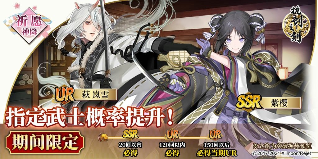 虽然天气渐冷,但是狸猫们可没有偷懒哦!十一月的狸猫们也有用心给公主大人准备礼物,岚雪和紫樱也来加入本期祈愿神降啦,是谁又在疯狂心动啦!话不多说,公主大人一起来看十一月的活动吧。 活动时间:11月1日 5:00~11月16日5:00 开放期间每日免费一抽福利!20次神降之内必得SSR或以上武士!(仅限1次)120次神降之内必得UR武士!(仅限1次)150次神降后可额外获得当期UP的UR武士*1!(仅