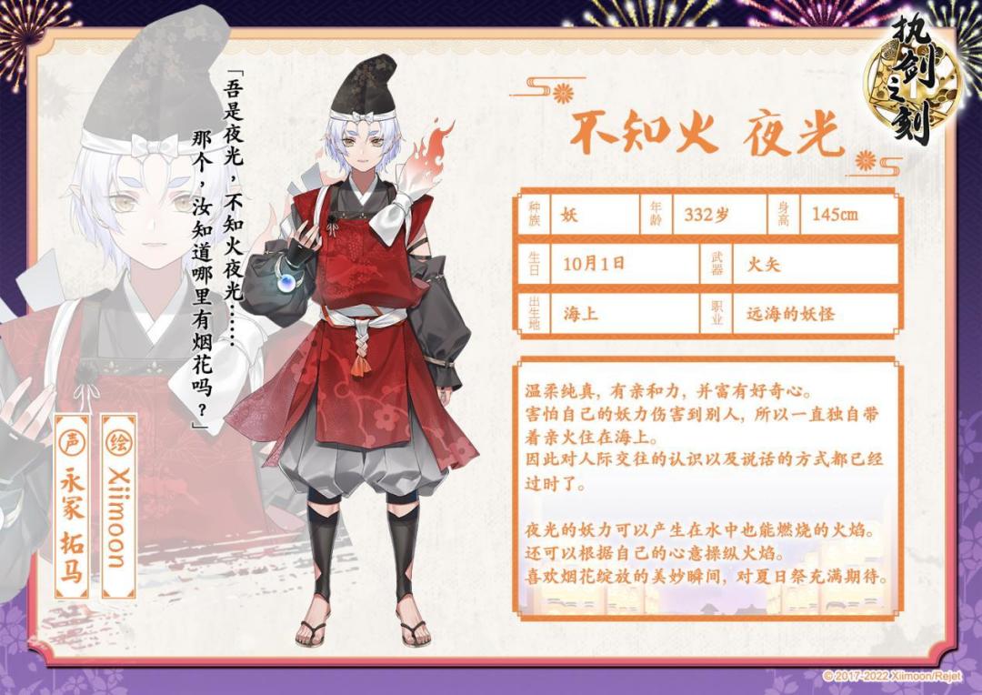 谦逊拘谨的不知火夜光诞生于镰仓时代,本体是一种名为不知火的妖怪。夜光拥有神奇火之妖力,可以将自己的火焰的一部分排出身体,变成与自己聊天,帮自己打探消息的亲火。 远离人类社群上百年的夜光,一直在海上独居,所以对一切都充满了好奇。他曾经尝试接近人类的城市,却因为控制不好自己的力量,而导致村子遭遇火焰之灾。 从此,夜光不敢过度接近陆地,总是在远离陆地的地方偷偷看着人类的村子或渔船,尤其喜欢看人们燃放的烟
