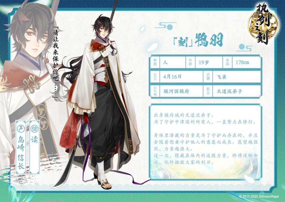 天道流出身的鸨羽认真而勤勉。他从不肯松懈修行,为了复兴天道流道场,为了能在危险之中守护中津国的大家,一直精益求精地努力训练,和这样的鸨羽一起并肩真是让人非常安心呢。 鸨羽不仅拥有强大的战斗力,在特殊时刻更会发挥自己的聪明才智,以智慧作为自己的迎战武器!即使面临千钧一发的危机,他也会临危不乱,果断地根据情况作出正确的判断。 卡帕:鸨羽大人的稳重,真是让人崇拜呀! 表面上是认真热血修行狂人,内心其实爱