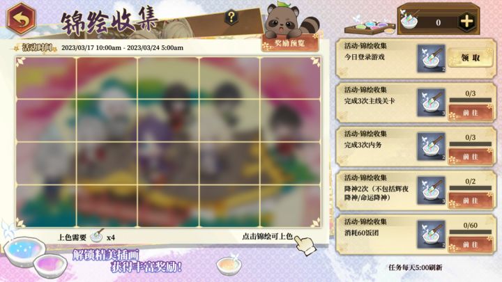 ◇锦绘收集◇活动时间:3月17日 10:00 ~ 3月24日05:00活动期间,完成活动任务点亮拼图,解锁丰富奖励! ◇刻御神签降神◇ 活动时间:3月17日 10:00 ~ 4月1日 05:00活动期间仅限一次,参与[刻]御神签降神必得[绯]阶[刻]武士! 详细版本活动信息请以游戏内实际内容为准,更多活动爆料可关注官方账号及游戏内公告!河童保护协会2023年3月16日