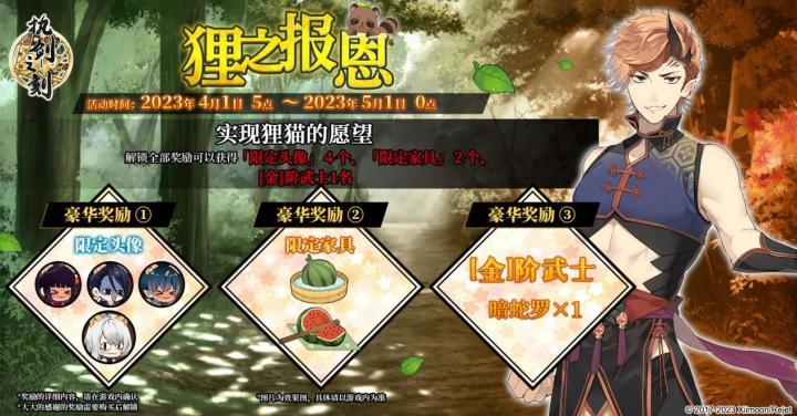 ◇月卡复刻◇活动时间:4月1日 05:00 ~ 5月1日05:004月月卡及月卡头像框复刻! ◇狸之报恩复刻◇活动时间:4月1日 05:00 ~5月1日00:00完成狸猫特别任务即可获得丰厚奖励,其中还有家具、武士头像及[金]阶武士-暗蛇罗。 ◇刻御神签降神◇活动时间:4月1日 10:00 ~ 5月1日 05:00活动期间仅限一次,参与[刻]御神签降神必得[绯]阶[刻]