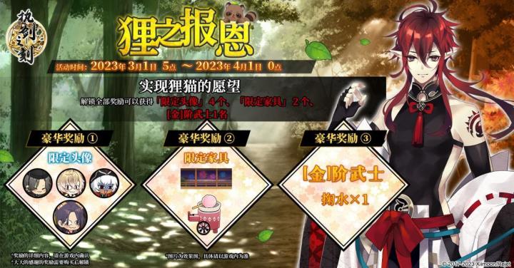 ◇月卡复刻◇活动时间:3月1日 05:00 ~ 4月1日05:003月月卡及月卡头像框复刻! ◇狸之报恩复刻◇活动时间:3月1日 5:00 ~4月1日00:00完成狸猫特别任务即可获得丰厚奖励,其中还有家具、武士头像及[金]阶武士-掬水。详细活动信息请以游戏内实际内容为准,更多活动爆料可关注官方账号及游戏内公告! 河童保护协会2022年2月28日