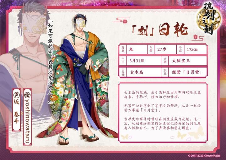日轮是来自女木岛的鬼族,他曾经失去一切重要之物,又找到了新的立身之处。如今的他,与月轮、茶半次一起经营着日月堂,为日月堂的兴旺而努力。他拥有如同太阳般温暖的性格,总是温柔地对待大家,设身处地地替他人着想,即使对方误会了自己,日轮也愿意先认真倾听对方的想法,再去解决问题,真的很难让人不喜欢呀!身材健硕,实力强劲的日轮还拥有一颗细腻的心,非常擅长治疗与修理东西,如果公主大人有什么需要,请不要客气尽