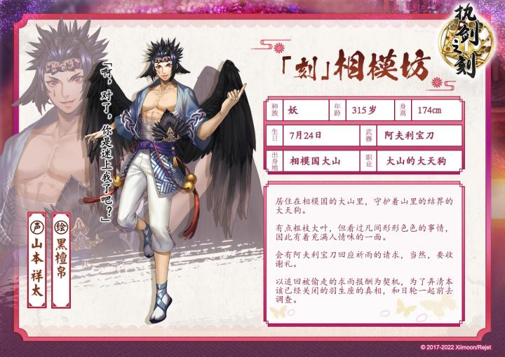 他是来自相模国大山中的天狗,拥有强大的祈雨能力。虽然多数时间都远离人类居住,事法则却十分“接地气”,从不掩饰自己重视金钱的一面,人生的信条就是拿钱办事。当然,虽说“金钱至上”,但相模坊偶尔也会做点亏本买卖。如果看到有人处于困境之中,相模坊还是无法做到视而不理,纵然嘴上一直在抱怨对方真是麻烦精,但行动却把他善良的本质暴露啦~说话直接的相模坊看似有些粗鲁,行动中还带着点莽撞。其实非常温柔细心,对同
