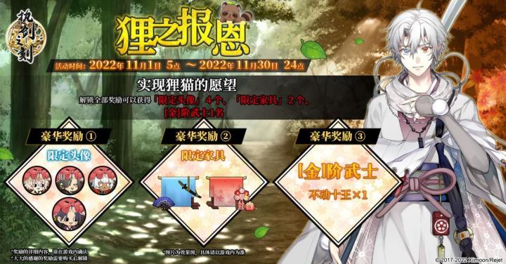 十一月活动开启,卡帕记者现在为您送上十一月活动情报:本期的主要内容有月卡上新、十一月狸之报恩奖励更新,详细活动内容如下:◇月卡上新◇活动时间:11月1日 05:00 ~ 12月1日05:0011月月卡及月卡头像框上新!◇狸之报恩上新◇活动时间:11月1日 5:00 ~11月30日24:00狸之报恩更新!完成狸猫特别任务即可获得丰厚奖励,其中还有11月专属家具、武士头像及[金]阶武士-不
