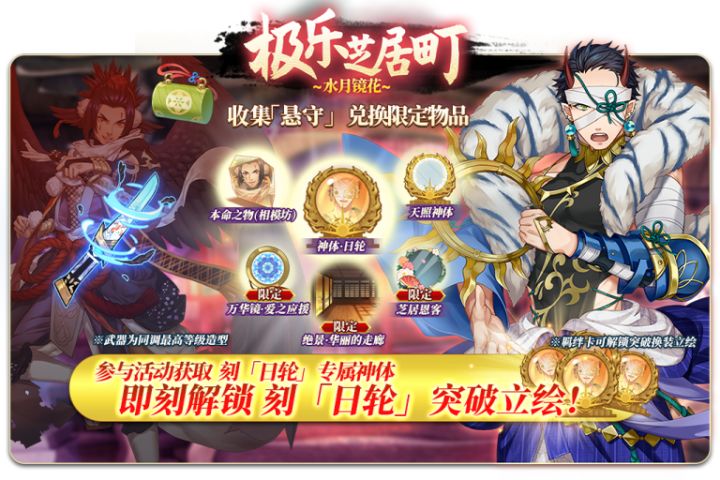 憧憬、仰慕、欢笑,为了那份不想辜负的期待......水月镜花之中隐藏着怎样的故事?大家能否在真实与虚幻中找回自我?11月4日,和新换装武士「刻」日轮、「刻」相模坊相约极乐芝居町·水月镜花!