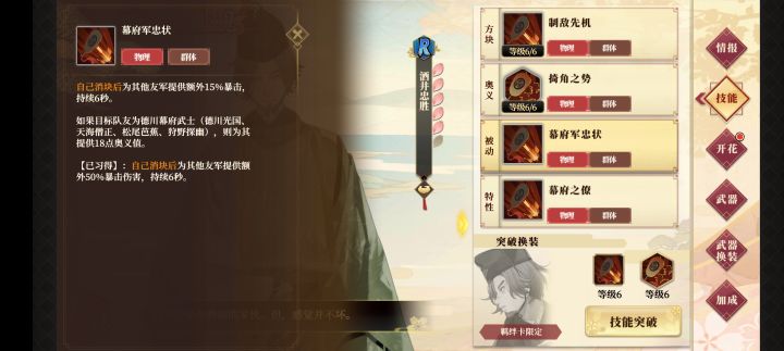 第6位:青波征一郎武士武器:法器(集气、残心)武器属性:攻击武士类型:法术、群体、单消专武效果:奥义击杀敌人时获得60点奥义值、奥义释放后的3秒内消块获得双倍奥义值武士介绍:法系里既能拐又能输出的存在,养起来后方块提供20%攻击力加成,奥义提供45%的攻击力加成,满技能情况下可额外为师生组(橘道生、萌夏、大吉、不包含刻卡)提供55%的攻击力加成,是后期橘道生不可缺少的一张辅助。也可以混搭与物理队当辅助,法系里当输出打。非常值得培养的一张卡就业环境:pve里百搭,可以给物理队拐也可以做为法系队伍的2号输出兼职辅助,性价比还是很棒的。