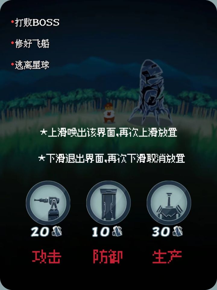 💡通关攻略①建筑建好可升级,一共三级。②火箭一共要修三次,第一次100,第二次200,第三次300,小零件探索地图可得。③怪物第二夜才会主动攻击,一共两只大Boss。🎈优点分析1)画面音效配合到位,晚上的音乐给人一种毛骨悚然的感觉,2D动态画面,围绕星球不会感觉太无聊。2)探索自由度高,基本没有新手引导。3)单机策略无内购(目前)。☹️缺点探讨1)游戏内容太少,很单一的一条游戏线