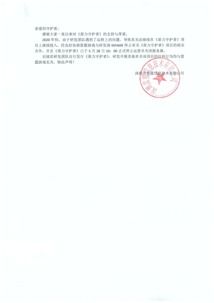 亲爱的守护者:感谢大家一直以来对《原力守护者》的支持与厚爱。2020年初,由于研发团队遇到了运转上的问题,导致其无法继续在《原力守护者》项目上继续投入,经友好协商雷霆游戏与研发商IDFAME终止有关《原力守护者》项目的相关合作,并且《原力守护者》已于5月28日10:00正式停止运营并关闭服务器。后续若研发团队自行发行《原力守护者》,研发开展其他有关该项目的任何行为均与雷霆游戏无关,特此声明!
