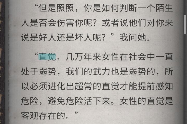 照照回答:“直觉。几万年来女性在社会中一直处于弱势,我们的武力也是弱势的,所以必须进化出超常的直觉才能提前感知危险,避免危险活下来。女性的直觉是客观存在的。”