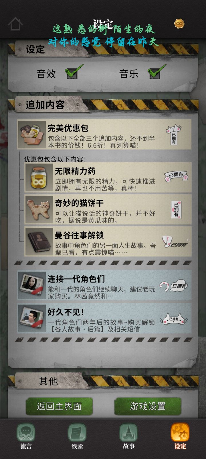 本人在多年前玩过第一部 但存档丢失 所以想一二部都玩一下我想要体验完整版故事 只氪与内容有关的(猫饼干 树洞 好久不见等) 提升体验的不氪(猫猫直觉 无限体力)第一部猫饼干6¥+机密文件6¥+各人故事12¥=24¥可以买完美包 相当于送无限精力番外 猫饼干6¥+曼谷往事6¥=12¥(还是可以买完美包 相当于送无限精力连接一代6¥+好久不见6¥=12¥一共24¥第二部树洞12¥