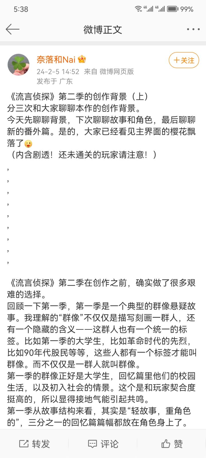 既然奈落本人在tap也说了打算和大家聊聊,但是只在微博上发布了内容,那我就自作主张地搬运到tap论坛了。不对具体内容过多评价了,奇文共欣赏嘛只想为老玩家说几句话,如果流言有很多新玩家加入,那我为流言高兴。如果没有,这样一个小糊作没有那么多玩家供你得罪。流言侦探更得很慢很慢,好几年了,老玩家能保持情怀和热爱,不容易。你可能不太在乎,但是每个玩家的意见都应该被尊重,是玩家,不是粉丝