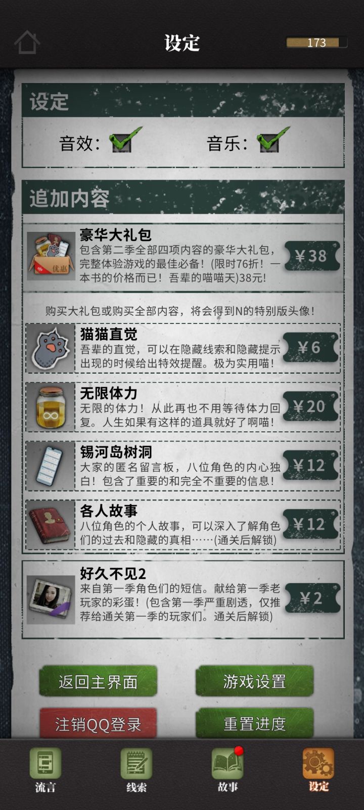 本人在多年前玩过第一部 但存档丢失 所以想一二部都玩一下我想要体验完整版故事 只氪与内容有关的(猫饼干 树洞 好久不见等) 提升体验的不氪(猫猫直觉 无限体力)第一部猫饼干6¥+机密文件6¥+各人故事12¥=24¥可以买完美包 相当于送无限精力番外 猫饼干6¥+曼谷往事6¥=12¥(还是可以买完美包 相当于送无限精力连接一代6¥+好久不见6¥=12¥一共24¥第二部树洞12¥