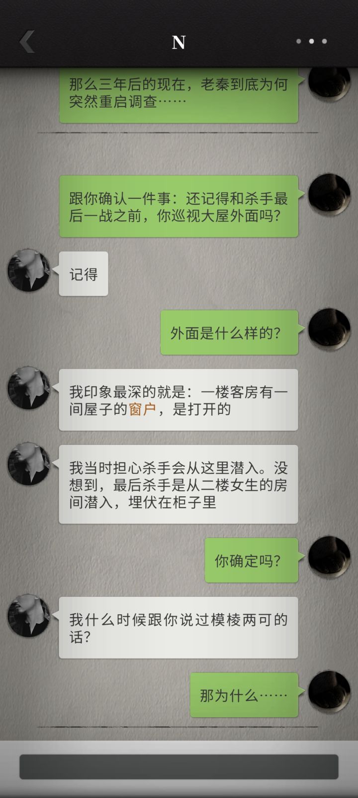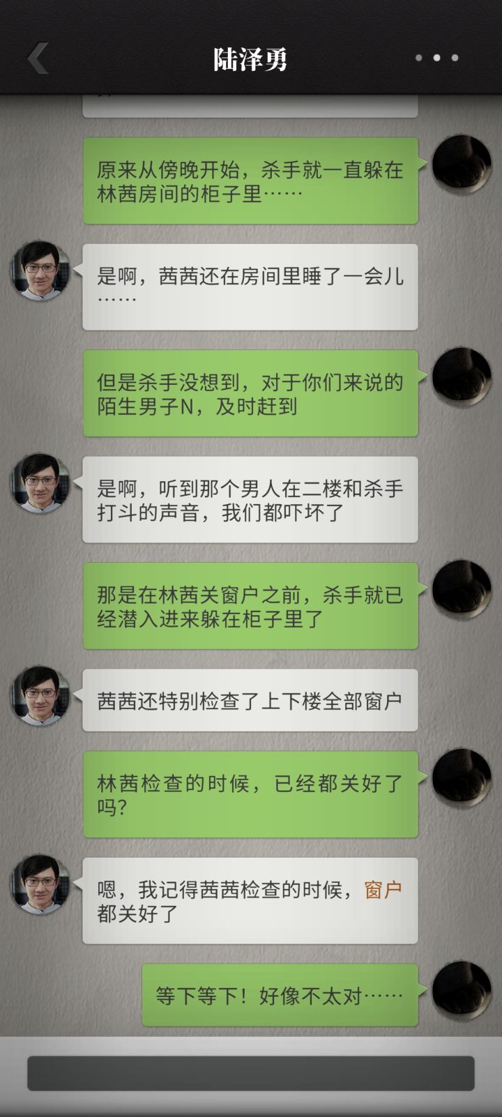 这里的剧情是红梅事件已经结束,但是作者提醒我们还遗漏了什么,真正的凶手恐怕在他们八人之中,让来看这两段聊天记录,陆泽勇说全部窗户已经关好了,而N进来检查的时候,一楼客房却有一间窗户开着,这时候我已经在怀疑凶手可能就是住在一楼的三人之一了,而后来真正的凶手却是早已下线的绍清,我个人认为这段线索除了能带偏我们的思路就毫无卵用了,而且我到现在都不知道是谁开的窗户,求大佬指点一二#发现好游戏