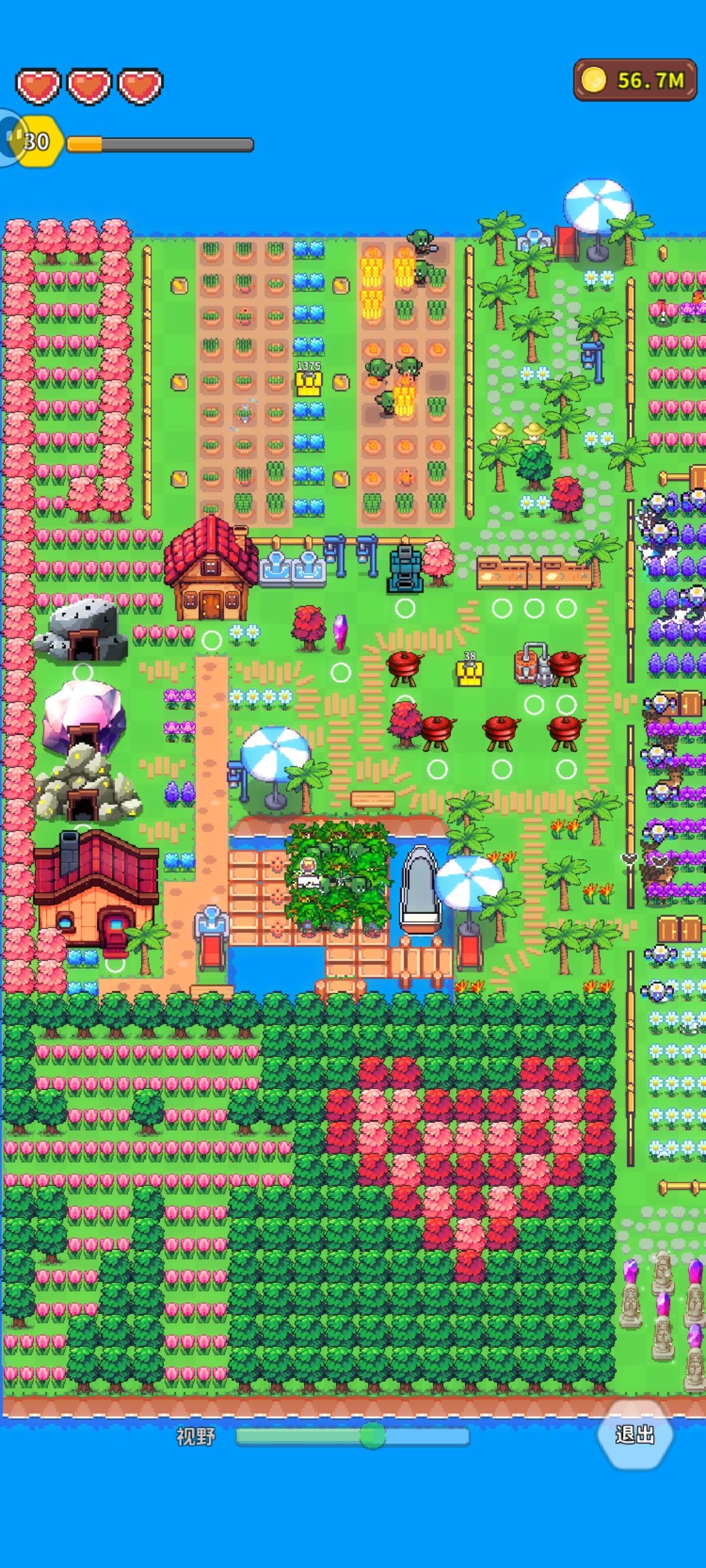 图一.我一直在想如何最高效率的利用有限的区域最合理的利用哥布林,如图,每个区域内一个收集箱5块地5只精灵5个蜂箱。为了不让无人机参与要保证所有地块在箱子的收集范围内。 图二.因为无人机不参与捡东西,所以他只剩下他的本职工作捕鱼业和畜牧业,收集箱子摆放的目的是为了不让无人机参与运输。路径短还不用收集效率自然好。 图三.200朵花8个品种每种25个,花的数量会影响蜂箱的收成速度,花与蜂箱的距离不会影响