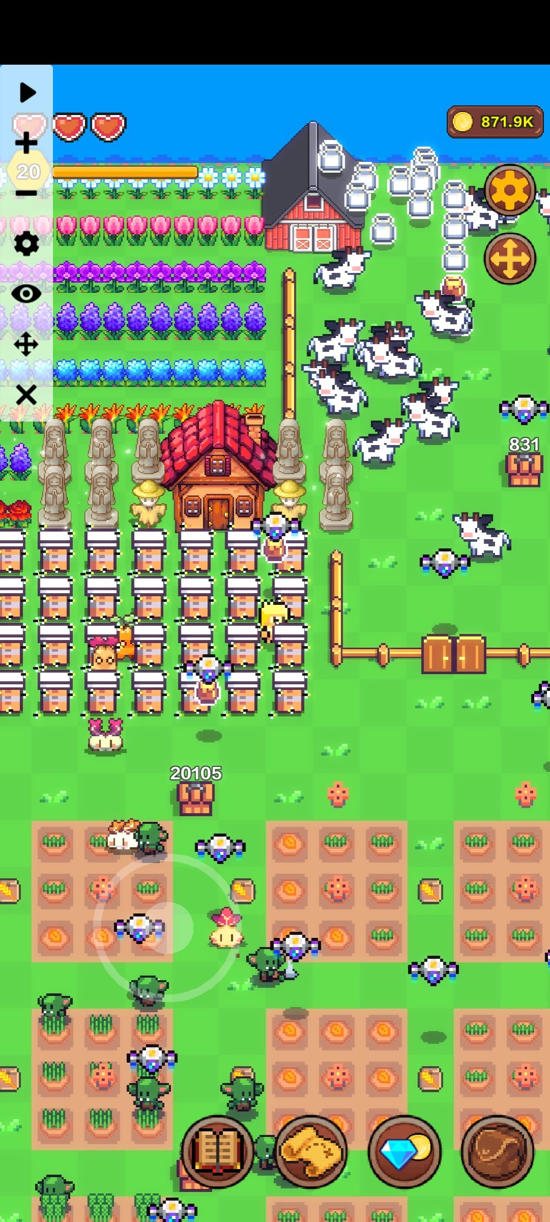 游戏是非常nice的,内容休闲,界面干净。后期还会出战斗,制造功能。 上干货: 1、上线先把下方第三个(钻石图标)里其他内的三个看广告点满:a精灵(苦力)b飞行器(只捡掉落物)c神像(送新的物种立马凑钱放出来)。精灵最重要的,可以种地可以浇水可以捡物品(5个),飞行器一次一个。(文章上面第二个图片所示)。 2、根据左边任务做,清掉任务也好几级了,每次升级都增加2块地4个家禽,都放出来,10级前用神