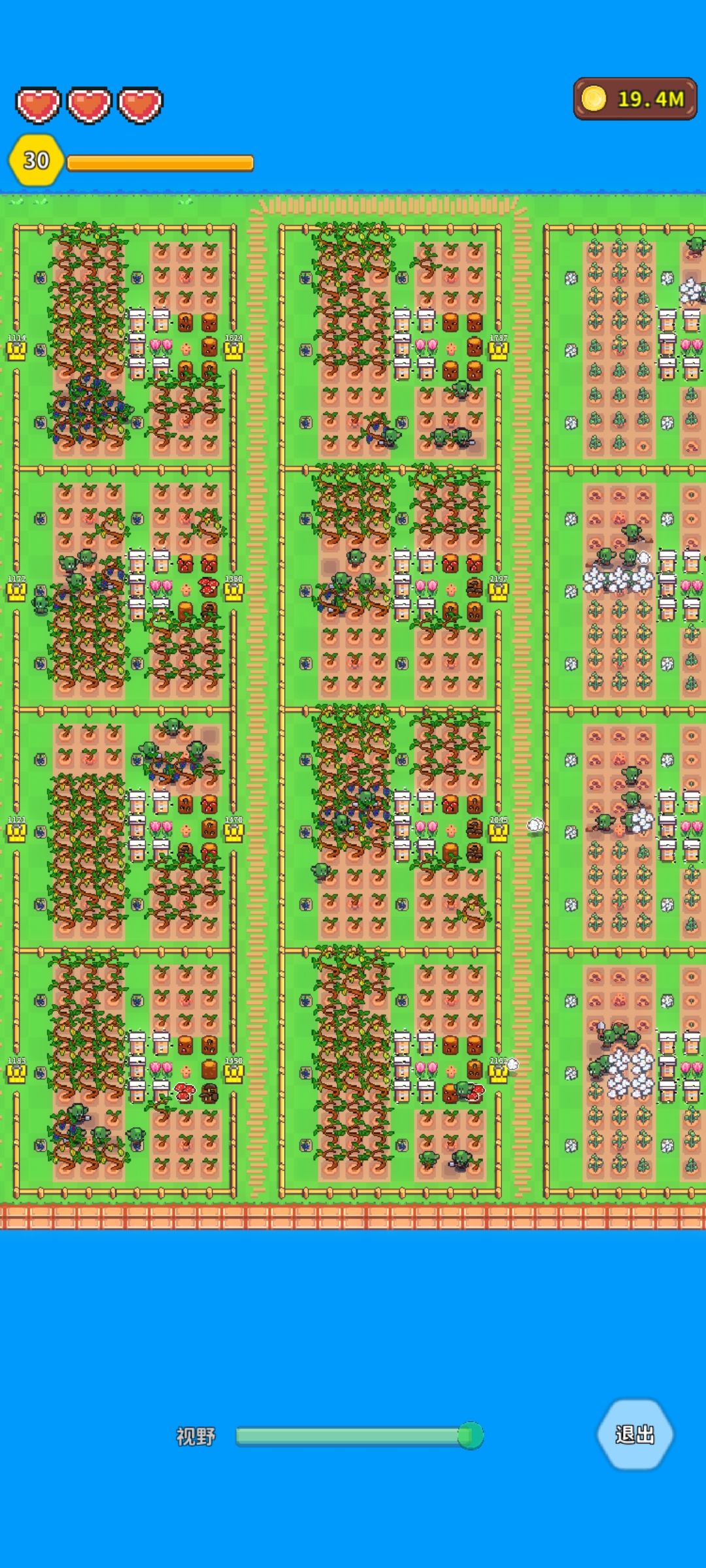 图一.我一直在想如何最高效率的利用有限的区域最合理的利用哥布林,如图,每个区域内一个收集箱5块地5只精灵5个蜂箱。为了不让无人机参与要保证所有地块在箱子的收集范围内。 图二.因为无人机不参与捡东西,所以他只剩下他的本职工作捕鱼业和畜牧业,收集箱子摆放的目的是为了不让无人机参与运输。路径短还不用收集效率自然好。 图三.200朵花8个品种每种25个,花的数量会影响蜂箱的收成速度,花与蜂箱的距离不会影响