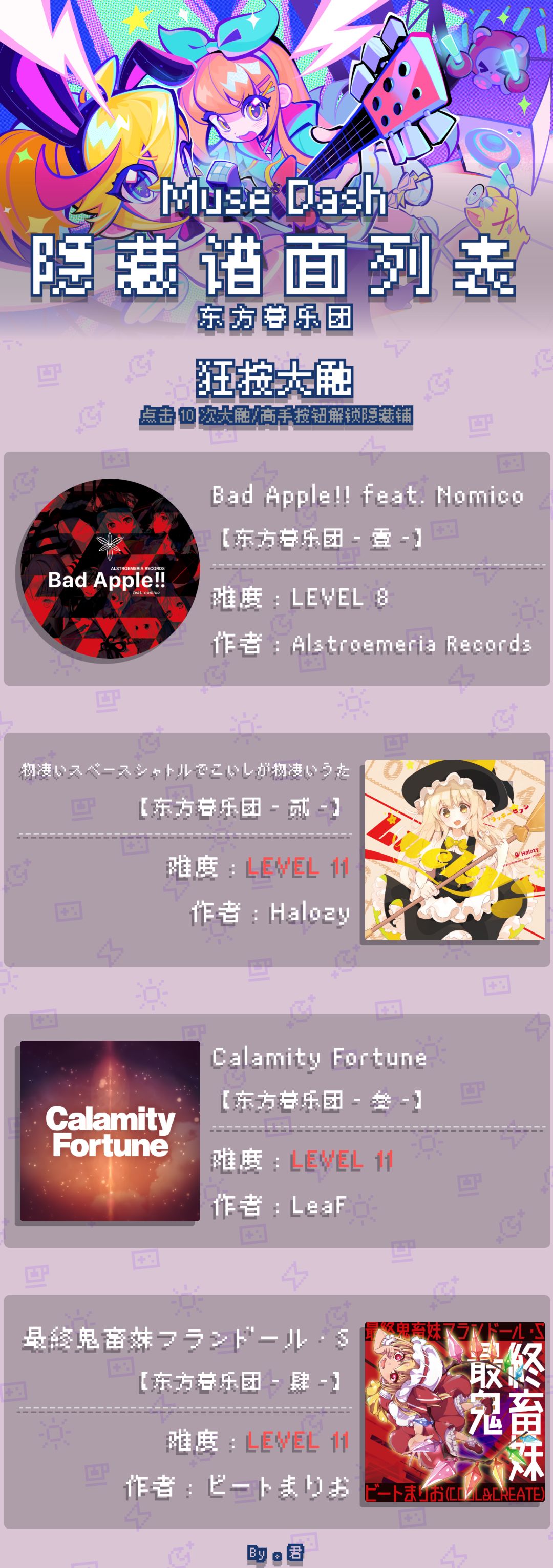 按最前首字母顺序排列,有不全和错误恳请指出。包含未知难度,中文谱面取谱名首字母排序,日语不进行排序 我不知道哪里可能和我一样出了里谱合集,撞车致歉,就当是为了方便我自己的 另:需要高手难度S评级及以上才能解锁的大触难度不会受自动解锁影响(如自动解锁9级难度的曲目等) 格式:曲名-(特殊)-解锁方法-难度 标☆的一律为里世界谱面,需要在角色选择界面选择并双击雾雨魔理沙/博丽灵梦身旁的迷你八卦炉/阴阳