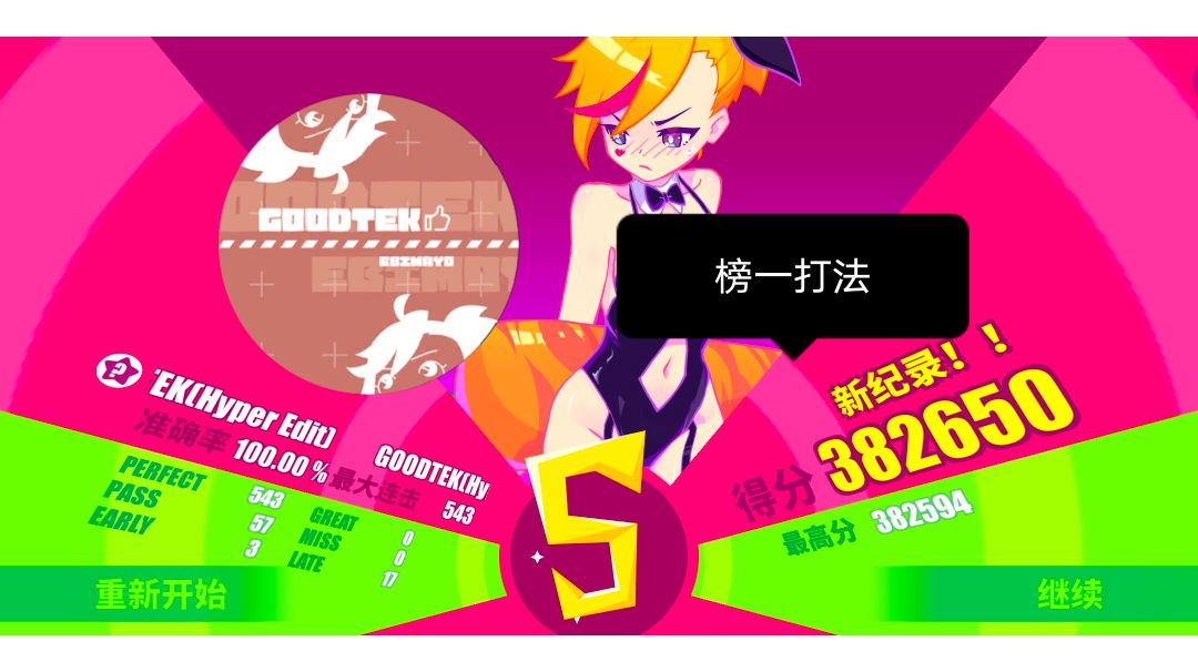 解锁方法︓日期调到2023.4月1日 GOODTEK(Hyper Edit)里谱Lv? 382650(+?)手动fever点位︓ 50-76(49有可能打great塞进f) 132-164(165可能打great塞进f) 229-258 301-331 389-414(387可能是放长条集满f秒开把388塞进f) 447-472 510-540(509可能打great塞进f 兔女郎小龙女巫)